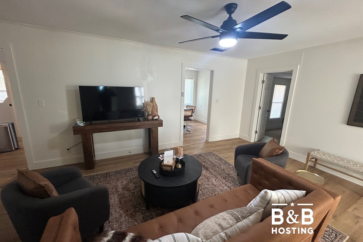 Redbud Retreat is a spacious 2BR/2BA brick patio home on a quiet private street, walkable to Redbud Park. With 1,400+ sq ft, it offers a king primary suite, second full bath, fast WiFi, 55” smart TV, fully equipped kitchen, dining/workspace, and two private patios for relaxing. Located off Buffalo Gap Rd near Hendrick Medical Center South, a quick drive to ACU, restaurants, and shopping. Ideal for couples, small families, or business travelers seeking a comfortable, convenient Abilene stay.