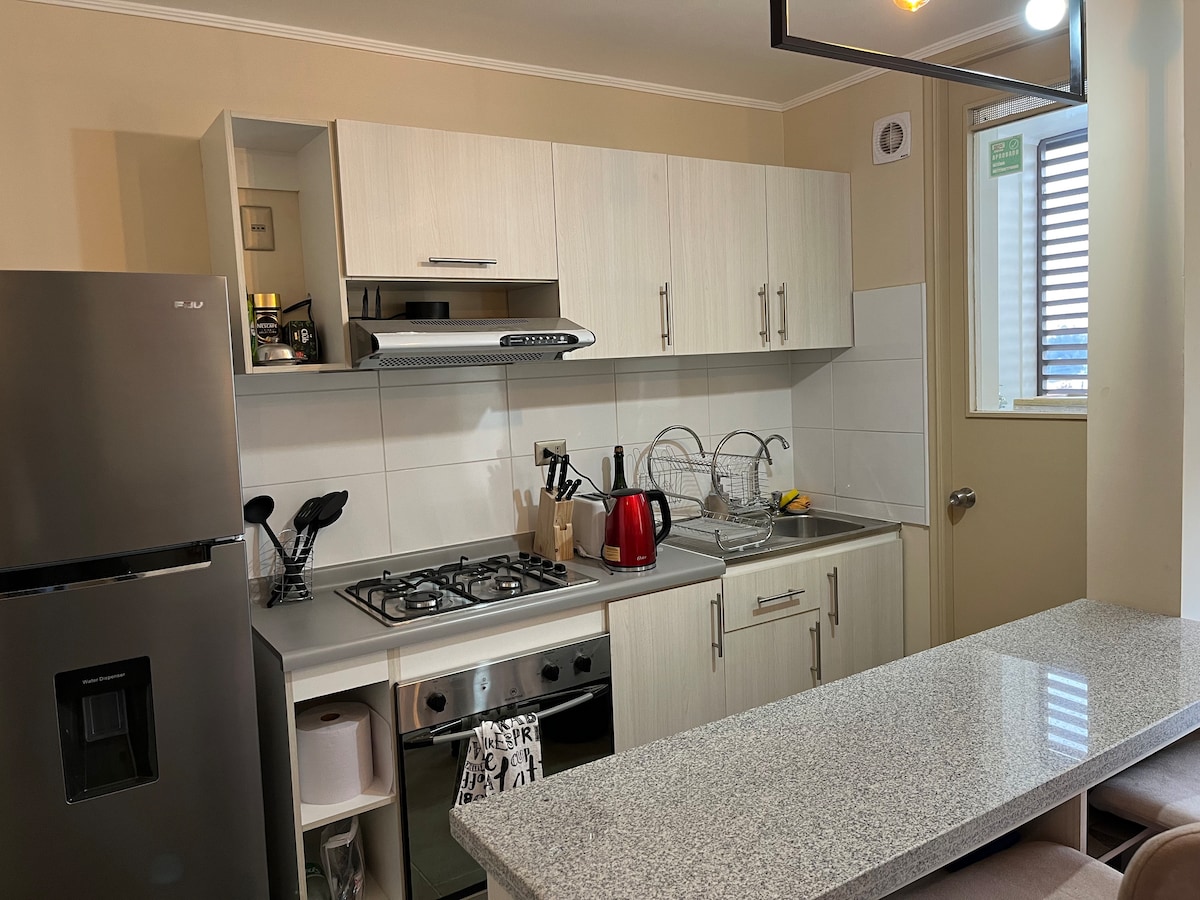Descubre la comodidad y tranquilidad en este hermoso departamento ubicado en el primer piso con conserjería 24 hrs . Consta con 3 habitaciones amplias y luminosas , una de ellas en suite, mantas adicionales, 2 baños completos, ventilador, calefactor, con estacionamiento privado , A pasos de supermercados , boulevard y centro de la ciudad, cocina y camas equipadas, WiFi fibra óptica , Smart TV , No mascotas, No toallas