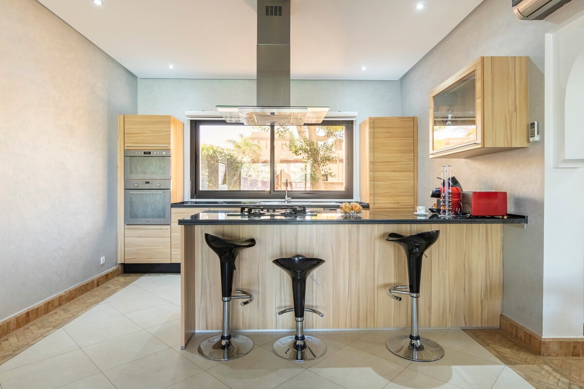 Indlu enendawo yokuphola entle kakhulu eyi-120m2 kumhlaba oyi-550m2 enamagumbi okulala ayi-2, amagumbi okuhlambela ayi-2, igadi enkulu evaliweyo engenayo i-vis-à-vis, ipuli yabucala eneveranda enkulu eyi-4*8m. Iveranda. Iindwendwe ziza konwabela izixhobo ezipheleleyo, ikhitshi eline-microwave, ioveni, umatshini wokuhlamba izitya. Indlu enendawo yokuphola ine-wifi, umatshini wokuhlamba impahla nayo yonke into oza kuyidinga ukuze ube neholide emnandi. Ifumaneka kwindawo ekhuselekileyo uDyar Shemsi, ungonwabela indawo yokupaka esetyenziswa nangabanye abantu, ipuli esetyenziswa ngumntu wonke eyi-300m2, ijimu, njl.