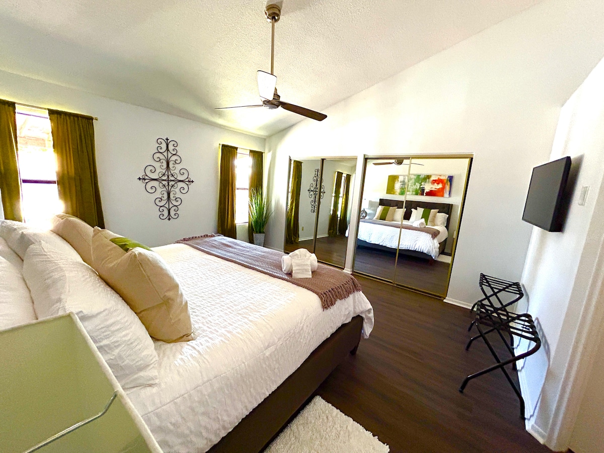Wamkelekile Kwiindawo Zokuhlala zeLuxe! Iholide yethu evulekileyo eAhwatukee enelanga, eArizona ilala iindwendwe eziyi-7 ezinebhedi enkulu enkosini, ukumkanikazi kwigumbi lokulala lesibini, kunye newele elipheleleyo kwisithathu. Yonwabela ikhitshi elinento yonke, i-Smart TV, i-WiFi neveranda yabucala. Izitepsi ezisuka echibini elihle, iindlela zokunyuka intaba, igalufa neevenkile, ezinokufikelela lula kwi-I-10 neLoop 202. Enoba ufuna ukuphumla okanye ukuzonwabisa, sikhona ukuze senze ukuhlala kwakho kube mnandi, kungabi naxhala ibe kungalibaleki!