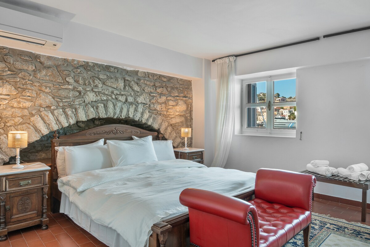 The Symi nautilus maisonette can comfortably accommodate up to 5 guests. Offers windows with seaview to the main port of Symi and magneficent view to the town of the island. It features traditional tiled and stone floors, high hand-painted wooden frames throughout, a queen-sized bed with 100% cotton coverings, as well as a dining area. The interiors in this suite are ravishing, reflecting a more classical style, dressed in soothing ice purple and neutral hues of brown.