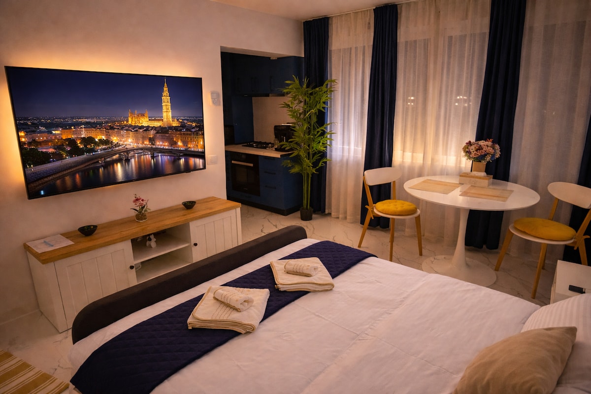 Yonwabela into enokonwatyelwa entle kule ndawo isembindini. Amagumbi ayi-2 akumbindi wePitesti kwimizuzu nje eyi-3 ukusuka kwiHolo Yesixeko, kwiitrasi, kwiigadi zasehlotyeni neemitha eziyi-500 ukusuka eVivo Mall. Le ndawo yokuhlala inomoya obandayo okanye oshushu, umatshini wokuhlamba izitya, umatshini wokuhlamba iimpahla, iTV eseskrinini esisangqa, ikhitshi elinezitya, ioveni yombane, i-hob yombane, i-microwave.