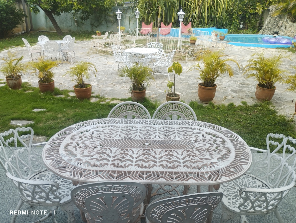 Quiet, gorgeous place amid tropical vegetation, in the best residential neighborhood of Siboney, three confortable rooms with air conditioning, private bathrooms and cable tv international, WIFI, minibar, huge patio with tiki house, banana trees, avogados, mango, guava, mamey, soursop, lime, a huge open sky terrace with bar for parties. Tranquillity, relaxing and green space with all comforts, kitchen, patio, terrace and bar. Daily quiet and green neighborhood, with hummingbirds and parrots