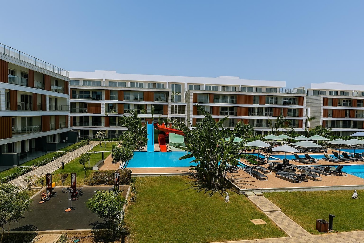 Rest and relax in a cozy and stylish home. Apartment with a separate bedroom. Glazed terrace. 2 air conditioners, large TV. There are more than 10 different swimming pools, cafes and restaurants, supermarkets with everything you need, 1 shop open 24 hours, pharmacy, ATM, currency exchange, beauty salon and spa salon, sauna, hammam, sports hall with various group sections, 4 large playgrounds, fields for football, tennis, volleyball and much more. Also, a free bus goes to the beach.