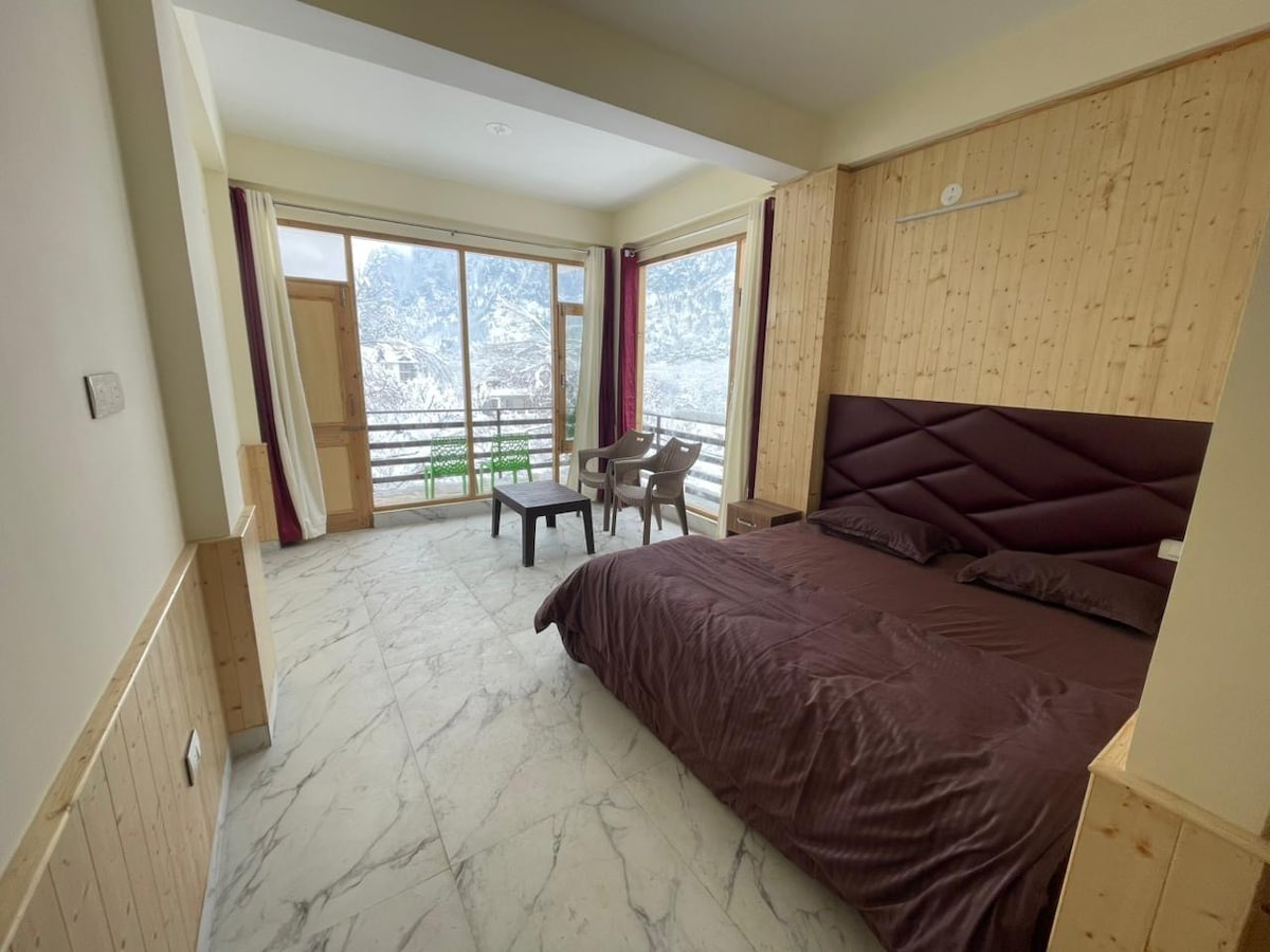 A cozy boutique mountain room wrapped in warm wood interiors and floor-to-ceiling views of the Himalayas. Wake up to sunlight, sip your coffee by the window, and unwind in a peaceful, stylish space designed for comfort and relaxation. Perfect for couples and travelers looking for a serene stay near Manali. This stylish and unique place sets the stage for a memorable trip.