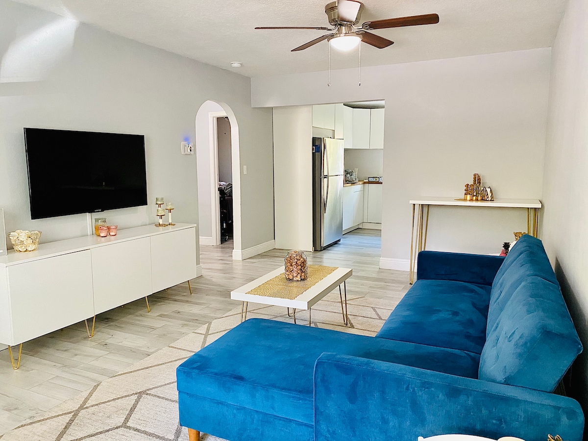 Ifenitshala 1 igumbi lokulala apt, umgangatho2nd, w/indawo yokungena yabucala. 3 iibhloko off of I -275, 20 imizuzu kude Bot. Iibhloko ezingama-20 ukusuka edolophini St.Pete (2 miles)leyo inika iimyuziyam, The Pier, imarike yafama ngoMgqibelo, zokutyela, kunye nobomi obumnandi ebusuku! 21 iibhloko kude neTropicana Field! Ndiyathemba ukuba ndiza kunika indawo yokuhlala enokuthula nepholileyo. Iindwendwe ziyakwazi ukungena kubanikazi beTiki Bar, i-grill, i-gazebo kunye neveranda kwindawo ebiyelweyo ngasemva kwendlu. Iflethi ibulala iintsholongwane ize icocwe kakuhle emva kokuphuma kondwendwe. Wamkelekile!