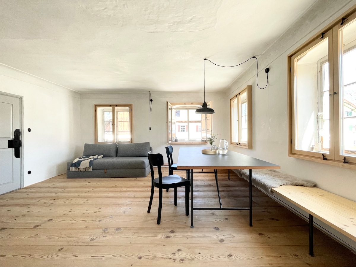 Le flethi ilungiswe ngokupheleleyo ikwimeko entle ibe ikumgangatho ophakamileyo wendlu esefama eyakhiwa ngeminyaka yoo-1930, eyabuyiselwa phezulu ibe iyazithanda kakhulu iinkcukacha. Yonke iflethi okanye indlu ekwicomplex enomoya wayo ikufuphi. Apha ungaphefumla ungaphazanyiswanga! Indlu esefama ifumaneka phantse kwindawo efihlakeleyo (ummelwane othe ngqo), ejikelezwe ziingqungquthela kunye namahlathi kwiOstallgäu entle.