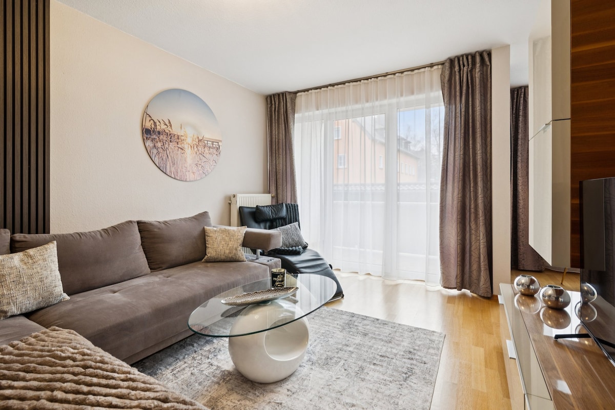 * Ukuphumla kwakho kwinqaba ejonge igadi endala yesiNgesi kunye ne-sauna * Le flethi ekhanyayo ehonjiswe kakuhle ngaphakathi nefenitshala ekumgangatho ophezulu ikwisihlomelo seBaroque Louisenthal Castle. Igumbi lokuhlala ekhitshini elivulekileyo, igumbi lokuhlambela lale mihla elineshawa yemvula, i-sauna, igumbi lokulala elijonge kwintlambo, ipiyano enkulu nomdlali orekhodiweyo weeyure zomculo, amathuba amaninzi okwenza izinto kule ndawo - Iflethi yamaphupha ukuze uphole uze uzive kamnandi!