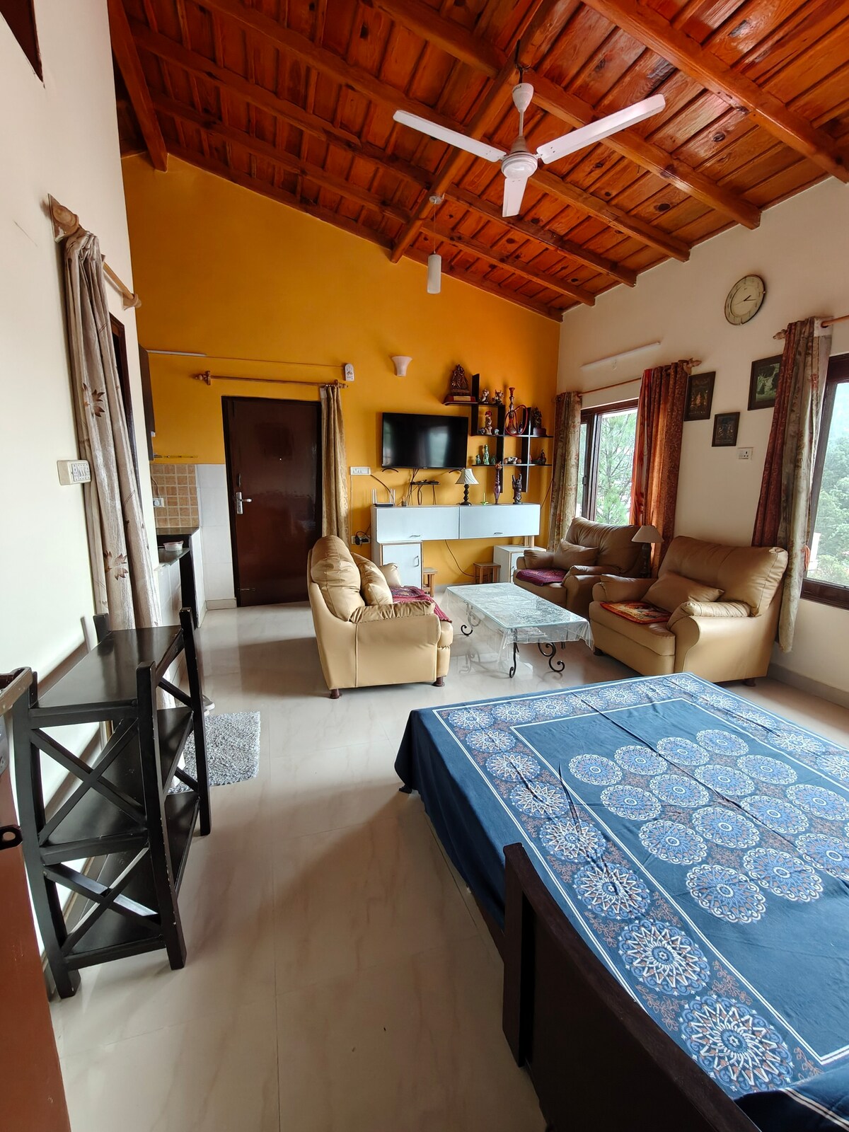 A peaceful hill homestay featuring a comfortable living room with two full-sized double beds, an attached bathroom, and a kitchen. The space opens to a huge terrace , perfect for relaxing mornings and cozy evenings. The property also offers private parking, making it a convenient and comfortable stay in the hills.