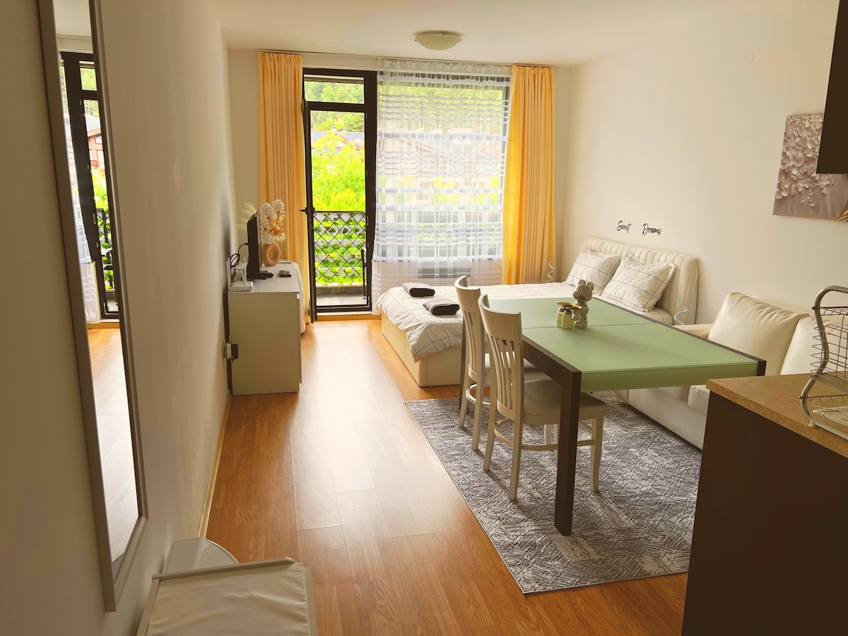 Iflethi yam yi-studio esitofotofo e-Aspen Golf Resort ekwindawo ezolileyo phakathi kweentaba zasePirin, eRila naseRodopi. Kukho imvume yasimahla yokungena kwiSpa, kwiJimu, kwiipuli zangaphandle nezangaphakathi. Le ndawo ilungele ukuhamba ngeenyawo, ukuhamba ngebhayisekile okanye ukuzonwabisa ngendalo. Indlu Yamaplanga yaseBansko ikumgama omfutshane wemizuzu eyi-15 ngemoto, kukho ii-shuttles eziya kwilifti ngexesha elisemthethweni lokutyibilika ekhephini le-10lv umntu ngamnye ngosuku. Kubathandi beGalufa, iPirin Golf yimizuzu eyi-2 xa uhamba ngemoto/imizuzu eyi-10 xa uhamba ngeenyawo ibe isebenza unyaka wonke.