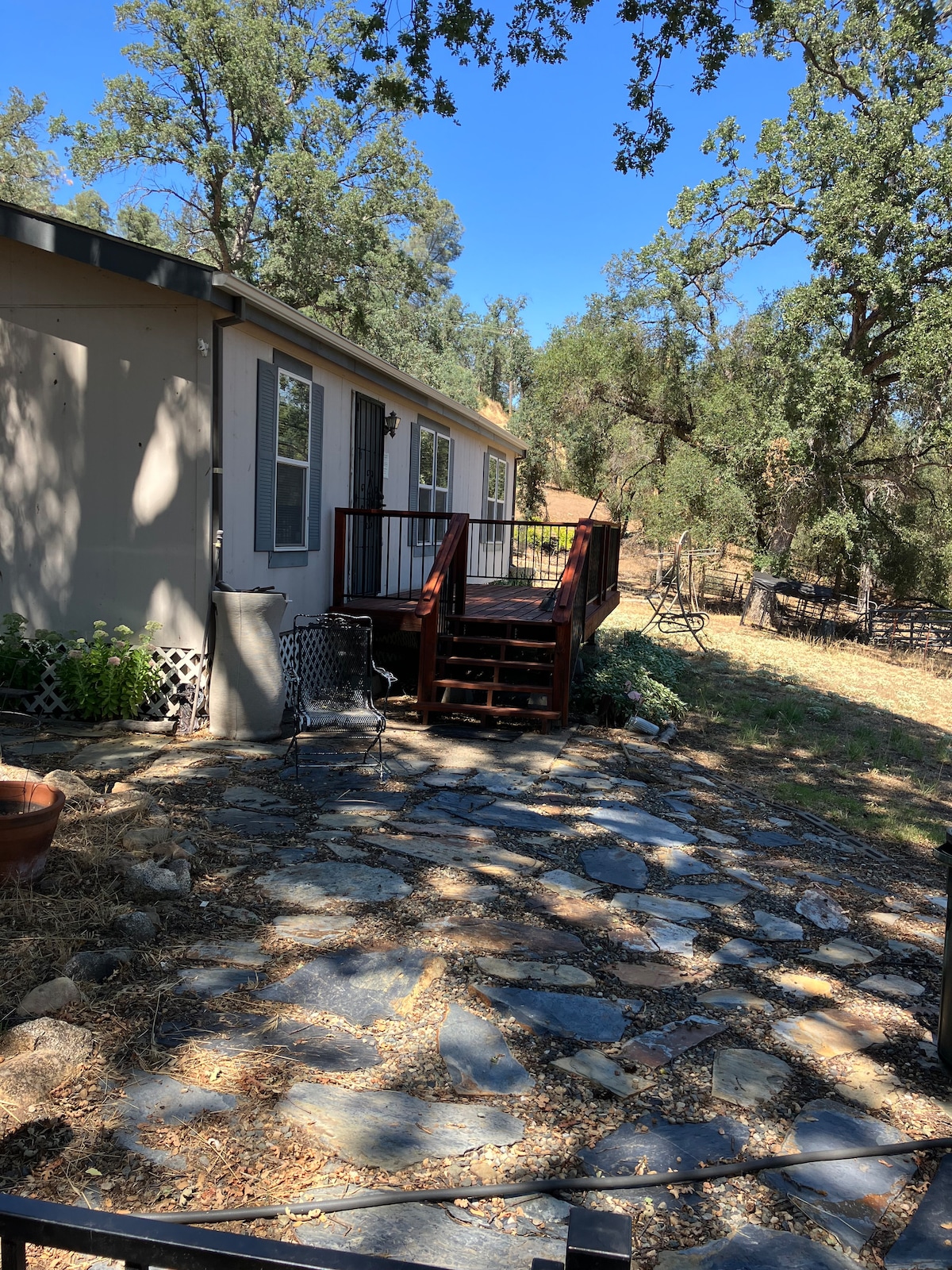 Indlu esemaphandleni entabeni entle, amagumbi okulala amabini, ikhitshi elipheleleyo, i-tv, i-wifi, i-PS 4. ukusetyenziswa komatshini wokuhlamba nowokomisa impahla. Ngaphandle nje kweHwy 49, imizuzu emihlanu ngemoto ukuya kuthenga kunye neendawo zokutyela e-Oakhurst. Imizuzu engamashumi amathathu emihlanu ngemoto ukuya kwihotele i-Wawona kunye ne-Mariposa grove, imizuzu engamashumi amabini ngemoto ukuya eBass Lake kunye neyure eyi-1.5 ngemoto ukuya kwintlambo yaseYosemite. Indawo yokuhlala ethe cwaka. Umnikazi uhlala kwiyunithi yesibini kwindlu. ilungele izibini okanye iholide yentsapho.