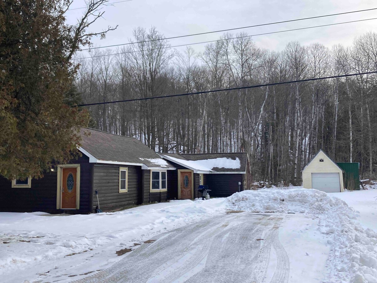Sine-Aframe entle eyakhiwe nge-1000 sq ft! Kutshanje kufakwe inkqubo yemidlalo yeqonga ye-100 intshi kwigumbi lokuhlala! Indlu yamaplanga iseLakes of the North, enendawo entle yokuzikhupha phandle. Icala ngokwemizila esecaleni! Sinee-kayak eziyi-2 zokusebenzisa (kufuneka zithuthwe) iibhodi zemingxunya yombona neebhegi, umzila wokukhwela i-UTV/ORV yakho, ukunyuka intaba, i-rafting eJordan Valley Outfitter, i-snowmobiling. Neevenkile zokutyela ezininzi ezintle, iindawo zokutyibilika ekhephini eziliqela nohambo losuku olufutshane! Ukongezelela, i-90 jet hottub yokuphumla!