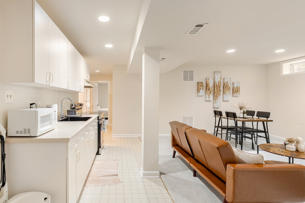 Wamkelekile kwi-Mid Century Comfort, ephakathi kweCollege Park neSilver Spring. Igumbi elinomgangatho ophantsi lithe zava kwaye lizolile. • Igumbi lokulala eliyi-1 • Indawo yokuhlala enesofa yokulala enkulu • Igumbi lokuhlambela elinendawo yokuhlambela • Ikhitshi elincinci • Indawo yokupaka engaphandle kwesitrato • Indawo yokosa ephandle Kulula uku: IYunivesithi yaseMaryland kunye Ukufikelela kwi-metro ukuze kube lula ukuya eWashington, D.C. Ilungele iintsapho, abantu abatshatileyo nabahambi bodwa-yonke into oyidingayo ukuze uphole.