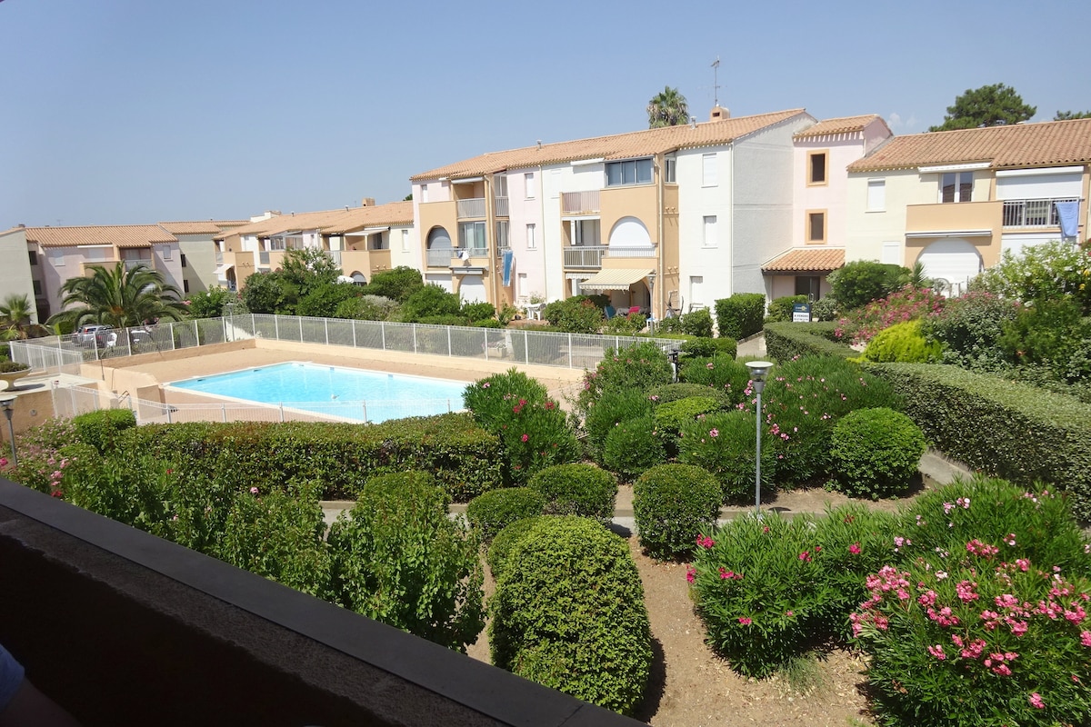 Iflethi okanye indlu ekwicomplex enamagumbi okulala ayi-2, kwibala legalufa, enendawo yokupaka, iCap d 'Agde