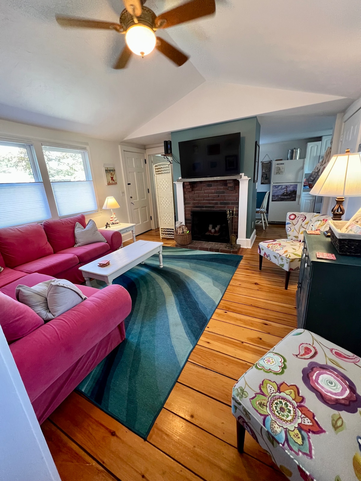 Isibini/intsapho eyonwabisayo unyaka wonke kwindlu esemaphandleni entle, yabucala yaseCape Cod w/eboniswe kwiveranda, iveranda neshawa yangaphandle (ngoNovemba/Dec/Jan iba yindlu esemaphandleni yeGingerbread). Ngaphakathi: indawo evulekileyo yokuhlala w/ ibhedi enkulu nendawo yokuhlala. Ileli ikhokelela kwi-loft yokulala enobude obufutshane w/ 2 iibhedi ezimbini. Indlu yangasese enendawo yokuhlambela w/ishawa yangaphakathi. Ikhitshi elincinci- jonga ingcaciso engezantsi. Sinikezela ngeti, ikofu yasekuhlaleni, iziqholo, izinto zokupheka, indawo yokosa igesi, amabhokisi omkhenkce, iitawuli zaselwandle nezitulo. Ukuze ulale ukuya kutsho kwi-8, uqeshise neGumbi lethu Eliphezulu kuAirbnb.