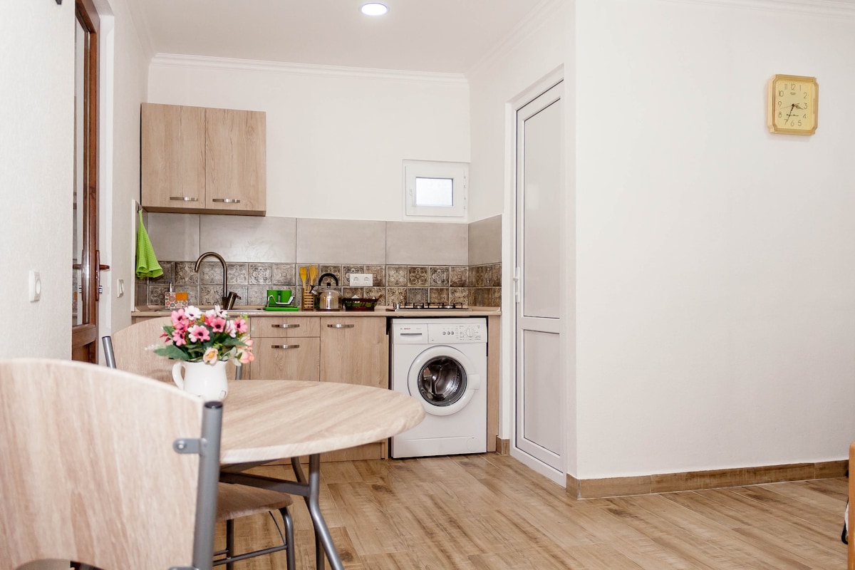 Iflethi okanye indlu ekwicomplex esandul 'ukulungiswa kwidolophu yaseTbilisi endala. Igumbi lokulala elinye(iibhedi eziyi-2), ikhitshi elinye (elinento yonke), igumbi lokuhlambela elinye, izinto zokuhombisa ezenziwe ngezandla nezikhethekileyo kwiflethi. Zonke iindawo ezibukwayo ezikumgama wokuhamba ngeenyawo, akukho zithuthi zisenokufuneka. Isikhululo seMetro iLiberty Square, kunye nevenkile enkulu iGaleria, iindawo zokumisa iibhasi zikumgama wemizuzu eyi-5 xa uhamba ngeenyawo. Indawo esembindini, kodwa yintendelezo ethe cwaka nethuleyo. I-wifi ekhawulezayo nezinzileyo, ukuzingenela/ukuphuma kuqinisekisiwe (isitshixo esinekhowudi).