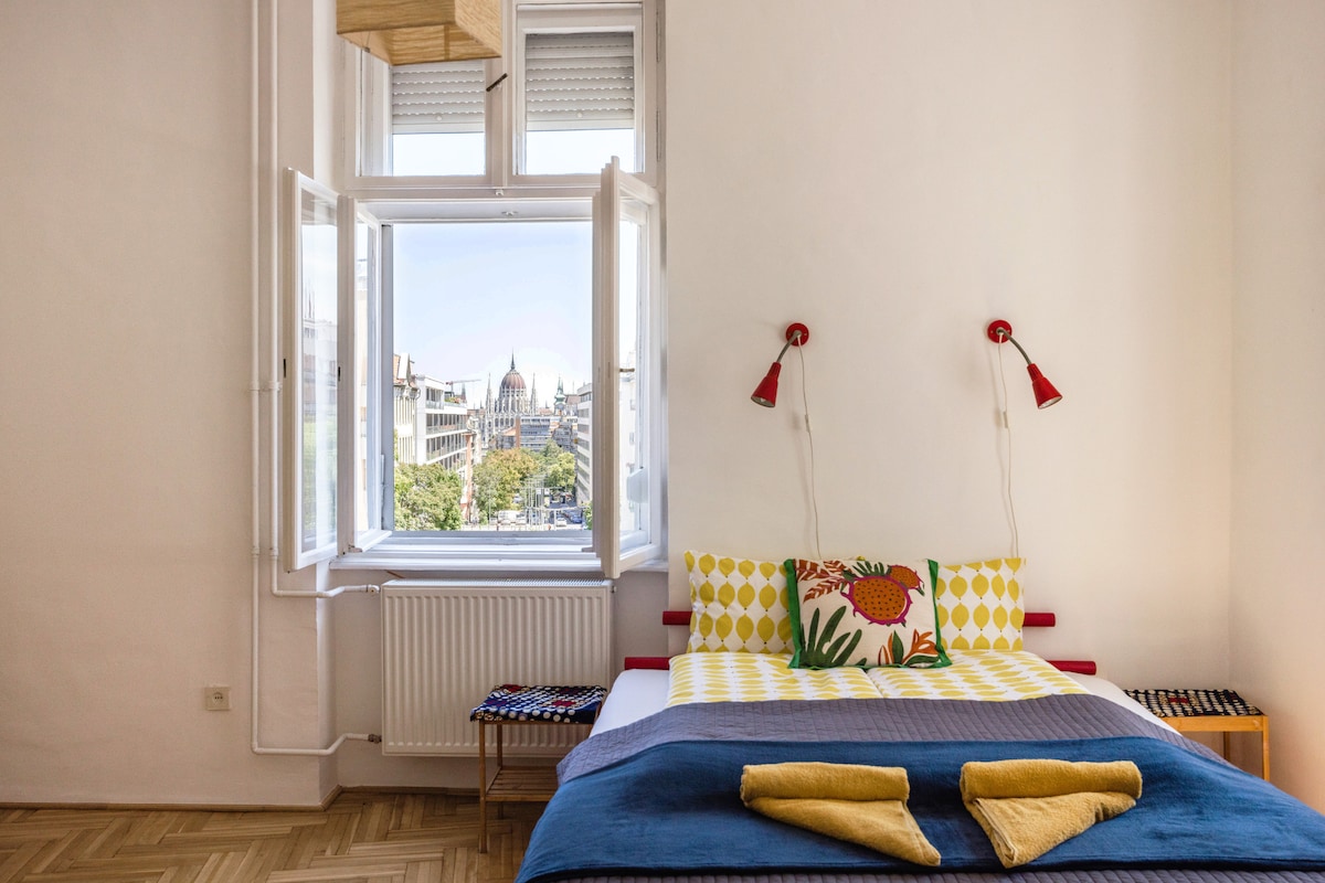Xa unokuphumla ngeglasi yewayini okanye uphuze ikomityi yekofu eshushu kwiflethi evulekileyo ngoxa uthanda ukujonga iphupha lePalamente kunye neDanube, ngoko, kutheni? Ezisandul 'ukulungiswa, le flethi yembali iphakathi esixekweni (i-metro-tram, iivenkile zokutyela neevenkile ezinkulu zonke zilahlwa ngamatye). Yeyona NDAWO ifanelekileyo yabahlobo, iintsapho nezibini ezityelele iBudapest. Abaninzi bayathandana nale ndawo inqabileyo neyinyani, ibe siyathemba nawe uza kuyithanda!