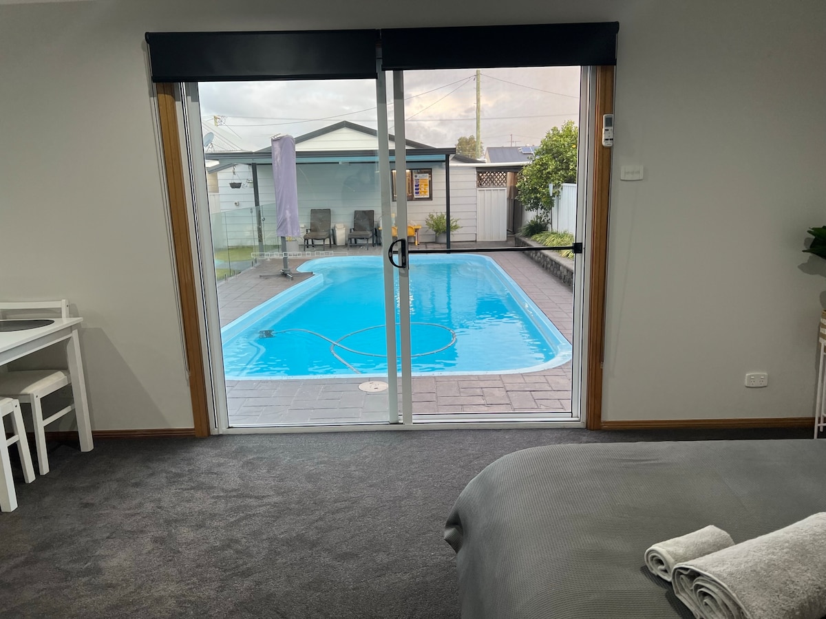 Isitudiyo sethu yindawo ezolileyo, esembindini. I-Pied-à-terre, ibekwe kwinduli yesibhedlele enembali, yindawo ethe tyaba enendawo yokuhlala/igumbi lokulala, enebhedi enkulu kunye nebhedi ekwayisofa ephindwe kabini. Inekhitshi elincinci eline-microwave, iketile ne-toaster kuphela. Isemva kwendlu ekwigadi entle. Iholide ethe cwaka ukusuka kwidolophu exakekileyo yaseCessnock kumgama wemizuzu eyi-10 ukuya kweyi-15, kunye nemizuzu eyi-8 ukuya kwisango leHunter Valley Vineyards.