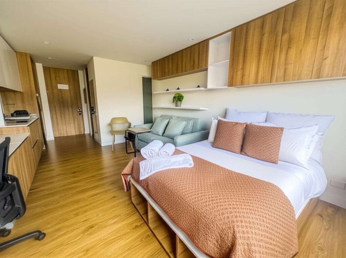 Wamkelekile kwiholide yakho entle! - Yonwabela iflethi okanye indlu ekwicomplex ehonjiswe kakuhle eyi-29 m² embindini weBogotá. - Inegumbi lokulala elitofotofo elinebhedi elala abantu ababini negumbi lokuhlambela labucala elineshawa enamanzi ashushu. - Ikhitshi elinefriji, i-microwave, nezinto eziyimfuneko zabantu ababini. - I-Smart TV neWiFi yokuzonwabisa neyokusebenza. - Izitepsi ezikude nesikhululo saseTransMilenio San Diego, iivenkile zokutyela zasekuhlaleni, iBarrio La Candelaria yembali, kunye neendawo zemali.
