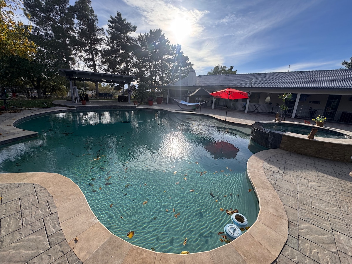 Ikwintlango yaseMojave nezitepsi ukusuka kwiCharleston Peak Winery, indlu yethu entle yepuli iCabernet Cabana yeyona ndawo ifanelekileyo onokuya kuyo wena neendwendwe zakho. Indlu yepuli ye-1400 square ft ilala abantu abayi-6 kamnandi ibe inepuli yabucala nebhafu enamanzi ashushu nendawo eninzi ngaphakathi/ngaphandle. Indlu enepuli ikwihektare eyi-1 1/2 kwingingqi ekumgangatho ophezulu. Sihlala kweyona ndlu iphambili. Indlu yethu ithe cwaka kakhulu, ikwindawo esecaleni, ibe inodonga. Kukho izinto ezininzi onokuzenza, kuquka itafile yepuli, iidarts, ii-horseshoes, imidlalo, njl.