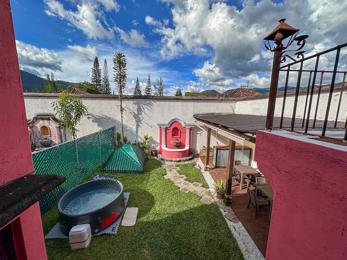 Sifumaneka embindini wembali ye-Antigua, eGuatemala. Ibhloko nje enye esuka eSanta Catalina Arch. Indlu etofotofo , ekumgangatho ophezulu enento yokwenza nezinto ezinokonwatyelwa zothando nezonwabisayo kwiholide yakho elandelayo. - Ii-suite eziyi-4 zodidi oluphezulu kunye nezinto ezinokusetyenziswa ezikumgangatho ophezulu - Ithala elikhulu lophahla kunye nokuhlala kwindawo yokuphumla - Ibhafu enamanzi ashushu - Igumbi le-spa - Indawo yokupaka enegadi (ixabiso elongezelelekileyo) , indawo yokupaka esitratweni nendawo yokupaka encinci ngaphakathi endlini - I-Wifi - Kufuphi neevenkile zokutyela ezintle, izinto zokuzonwabisa ebusuku, imbali