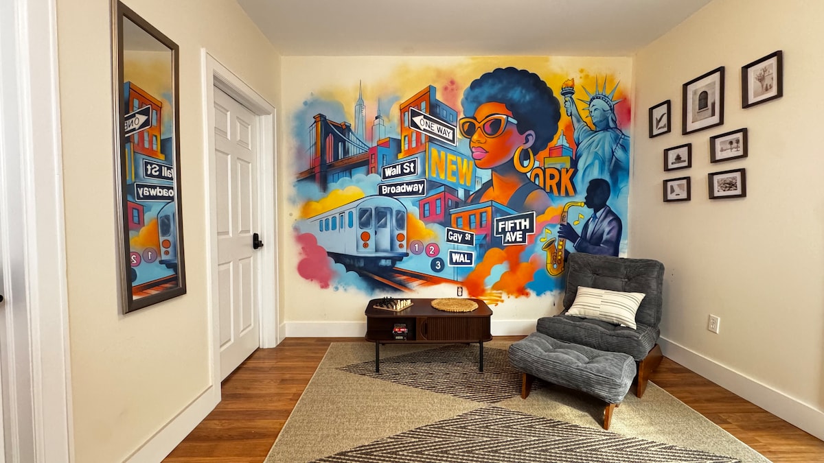 isitudiyo esincinci esisetyenziswa nguwe qha esisemizuzwini eyi-25 ukusuka eTime Square(kwiSixeko saseNew York). Ikude kwindawo yokumisa ibhasi ukuya eNYC. Ilungele abahambi bodwa okanye abantu abatshatileyo abafuna indawo yokuphumla emva kosuku olude bebuka iSixeko saseNew York. Istudiyo esinegumbi elinye elinendawo yokulala, (ibhedi enobukhulu obupheleleyo) ikhitshi elincinci negumbi lokuhlambela elipheleleyo