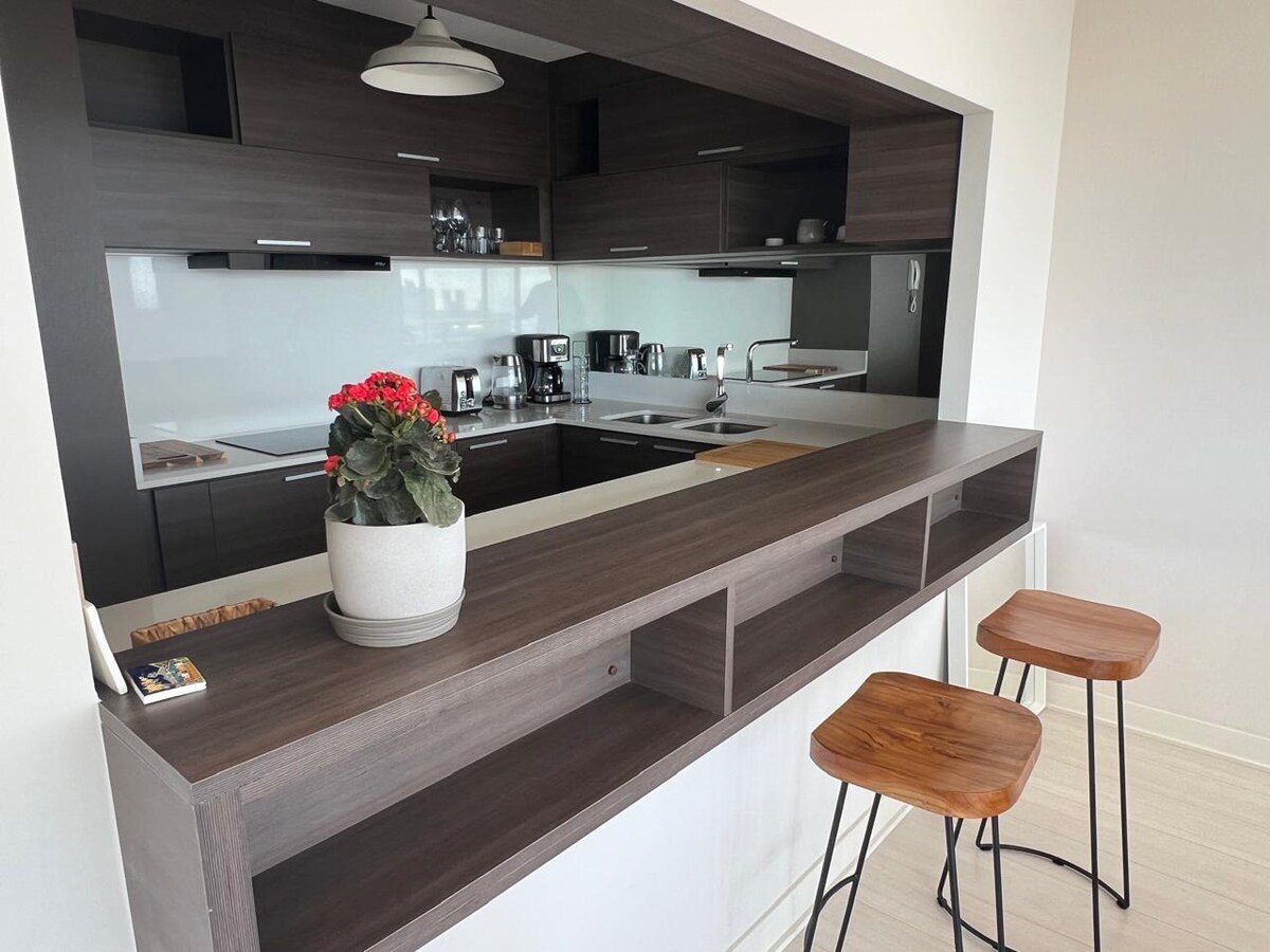 Phola kule ndawo ithuleyo nehonjiswe kakuhle. Ukubona ulwandle ngendlela esemagqabini. Isakhiwo esinezinto eziliqela, kuquka: ipuli yangaphandle, ipuli yangaphakathi efudumeleyo, i-sauna, igumbi lepuli, ikhefi, phakathi kwezinye. Phola xa ulala ngesandi sendalo samaza🌊. Le flethi ikumgangatho we-5, inamagumbi okulala ayi-2 namagumbi okuhlambela ayi-2 apheleleyo. Ikhitshi elinento yonke. Ine-Smart TV ne-Wi-Fi. Iindawo zokupaka ezingaphantsi komhlaba eziyi-2. * AKUKHO ZILWANYANA ZASEKHAYA ** Ezona ntsuku zimbalwa zibhukishiweyo eziyi-2