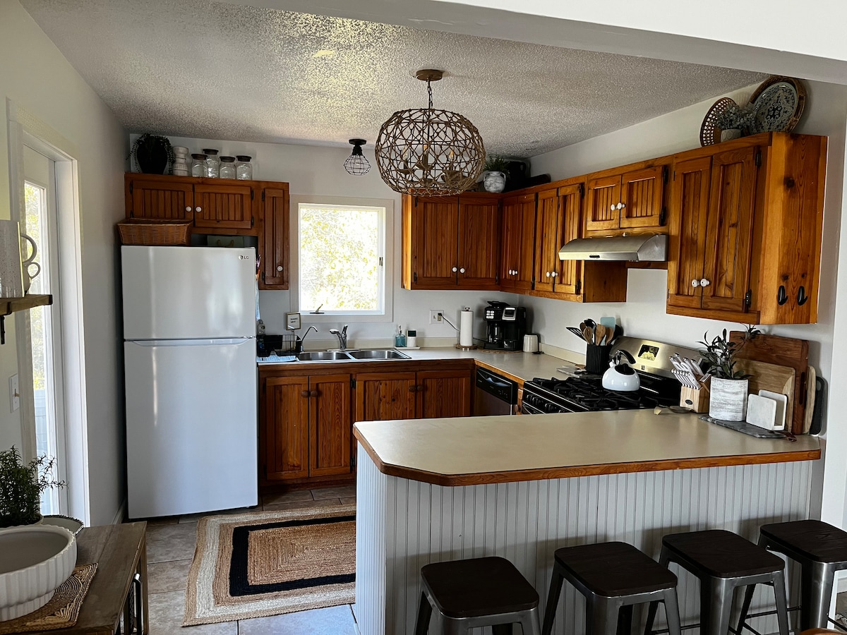 Indlu encinci kwiiBhanki ezingaphandle...Ekhanyayo, kwaye mihla... ilungele abantu aba-2! -Ibhedi enamashiti athambileyo -Kitchen enesitovu, umatshini wokuhlamba izitya, ifriji, iimbiza, iipani, izitya, iFrench Press, iKeurig, iketile yeti, imbiza yeti, izinto zebhari -Luxurious tiled eshaweni/igumbi lokuhlambela -Relax kwibhafu yezinto zakudala iphuma kwiveranda engasemva -10x16 iveranda exhotyiswe nge-grill yegesi kunye nomngxuma womlilo kunye ne-hammock -outdoor shower -smart tv -ibhayisekile, i-kayak, ii-surfboards, ibhodi yokubheqa, i-yeti cooler, izitulo zaselwandle, kunye nesambulela
