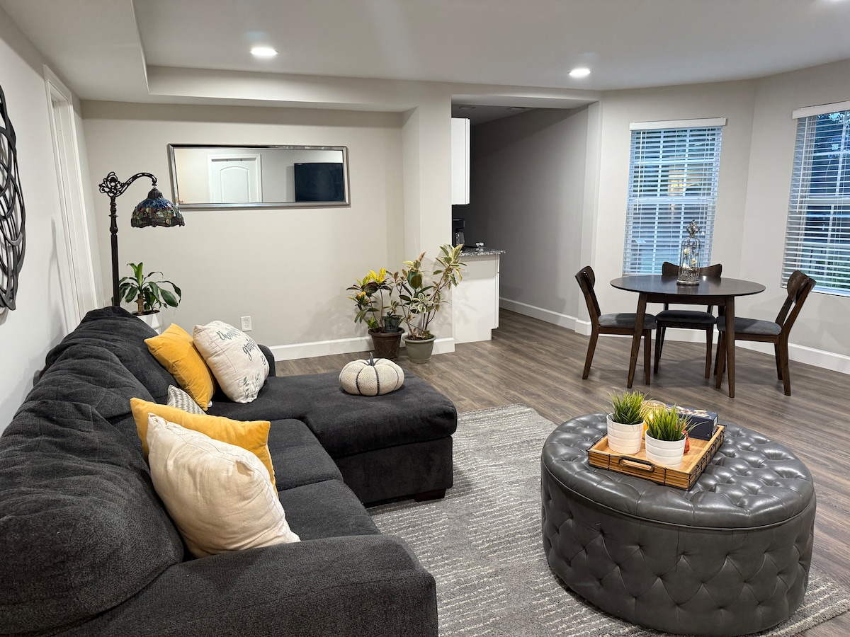 Yonwabela igumbi lakho lokulala elingaphantsi elinayo yonke into oyidingayo ukuze uhlale kamnandi — ngexabiso elingazukophula ibhanki! Le ndawo iquka indawo yokungena yabucala, indawo encinci ephandle ebiyelweyo, igumbi lokulala elinebhedi enkulu, idesika, igumbi lokuhlala, igumbi lokuhlambela nekhitshi elincinci elineKeurig, i-microwave, i-toaster oven, ifriji, into yokuhambisa amanzi ashushu/abandayo, neepleyiti ezilahlwayo + izinto zokusika. (Akukho sinki yasekhitshini ifumanekayo) I-Roku TV iqukiwe. Indawo yokupaka yasimahla esitratweni. Imizuzu nje eyi-10 ukusuka edolophini iLawrenceville!