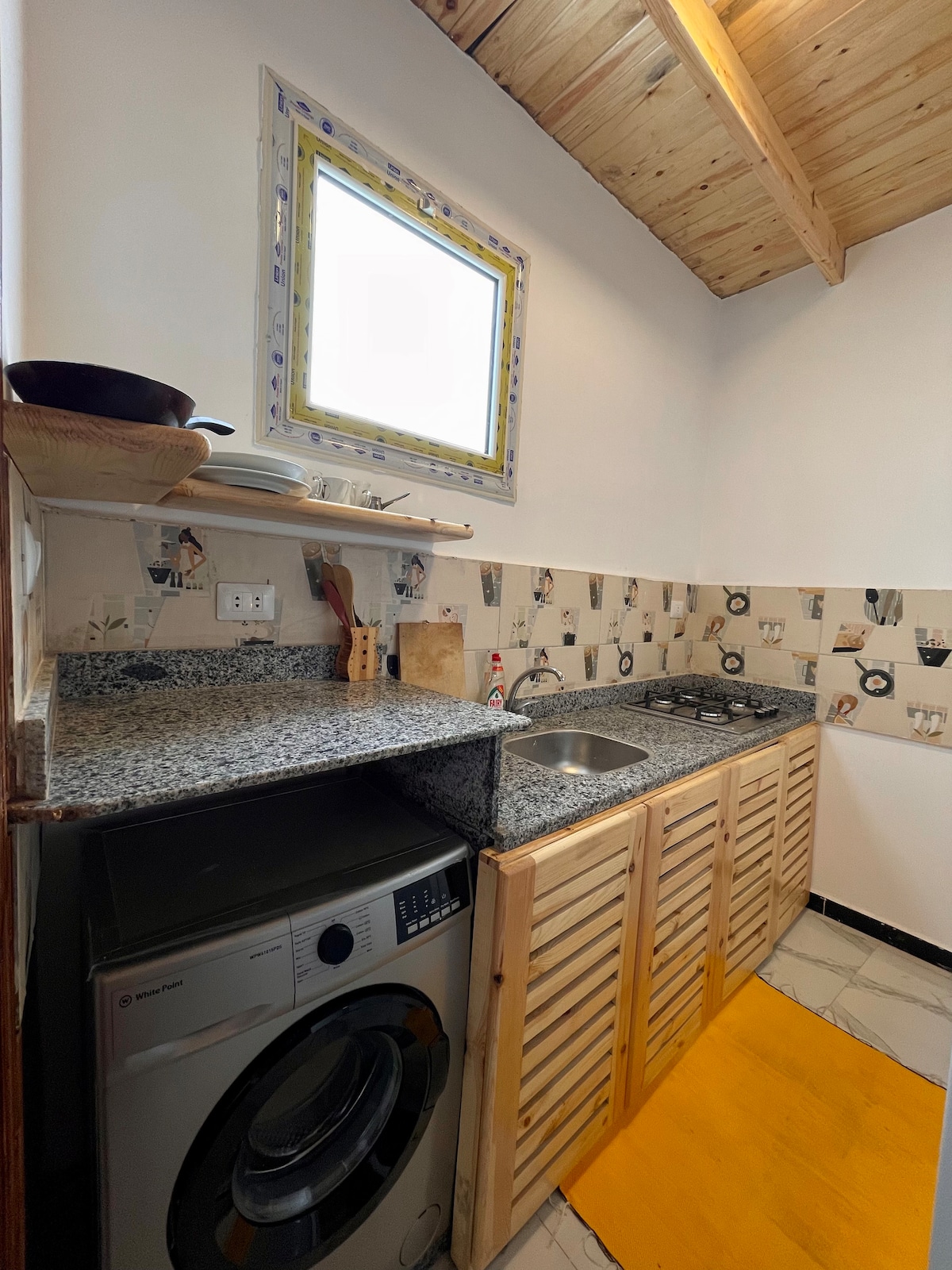 🏡 Cozy Bedouin/Boho style Chalet in Asala 🛏️ 1 BR with king bed + 2 ground mattresses 🔐 Self checkin ❄️ A/C 🖥️ Work space 🛜 WiFi 🍳 Equipped kitchen (Oven) 🧺 Full auto washing machine 🪵 Bedouin-style patio with cushions, kilims & fire pit 🪢 Macrame chair swing 🌊 5mins 👣 to Asala beach&Square 🤿 10min 👣 to Eel Garden dive site 🚨 15min 👣 to Lighthouse Area 🌍 Ideal for nomads, scuba divers, freedivers, kite surfers, hikers, climbers, slow livers