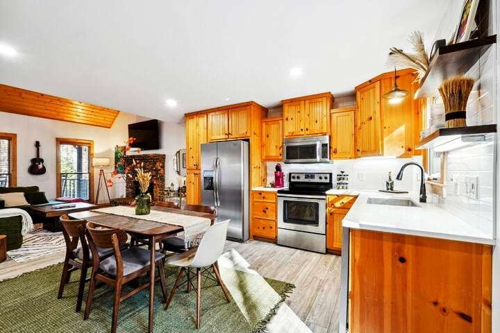 Indlu enevaranda eneglasi imema indalo, ihleli ehlathini nemizuzu eyi-10 ukuya eDahlonega. Iibhedi ezinkulu/umatrasi ophezulu womqamelo, izinto zebhedi ezikumgangatho ophezulu. Ulimi nesilingi ye-groove w/slate fireplace, umgodi wokubasa umlilo, iBath w/slate shower, iitawuli zeplush. Izixhobo zasekhitshini zentsimbi, umphezulu weglasi, ioveni, umatshini wokuhlamba izitya, i-microwave, i-toaster oven, ifriji, izitya, izinto zokupheka neKeurig. Iveranda yethu ephandle enezinto zokubraya ikulindile.43 ″ HDTV Roku's equipped w/Disney, Hulu, Max, Netflix, Paramount. I-Lic Yokuqeshisa Ngendawo Yokuhlala Ixesha Elifutshane #4829