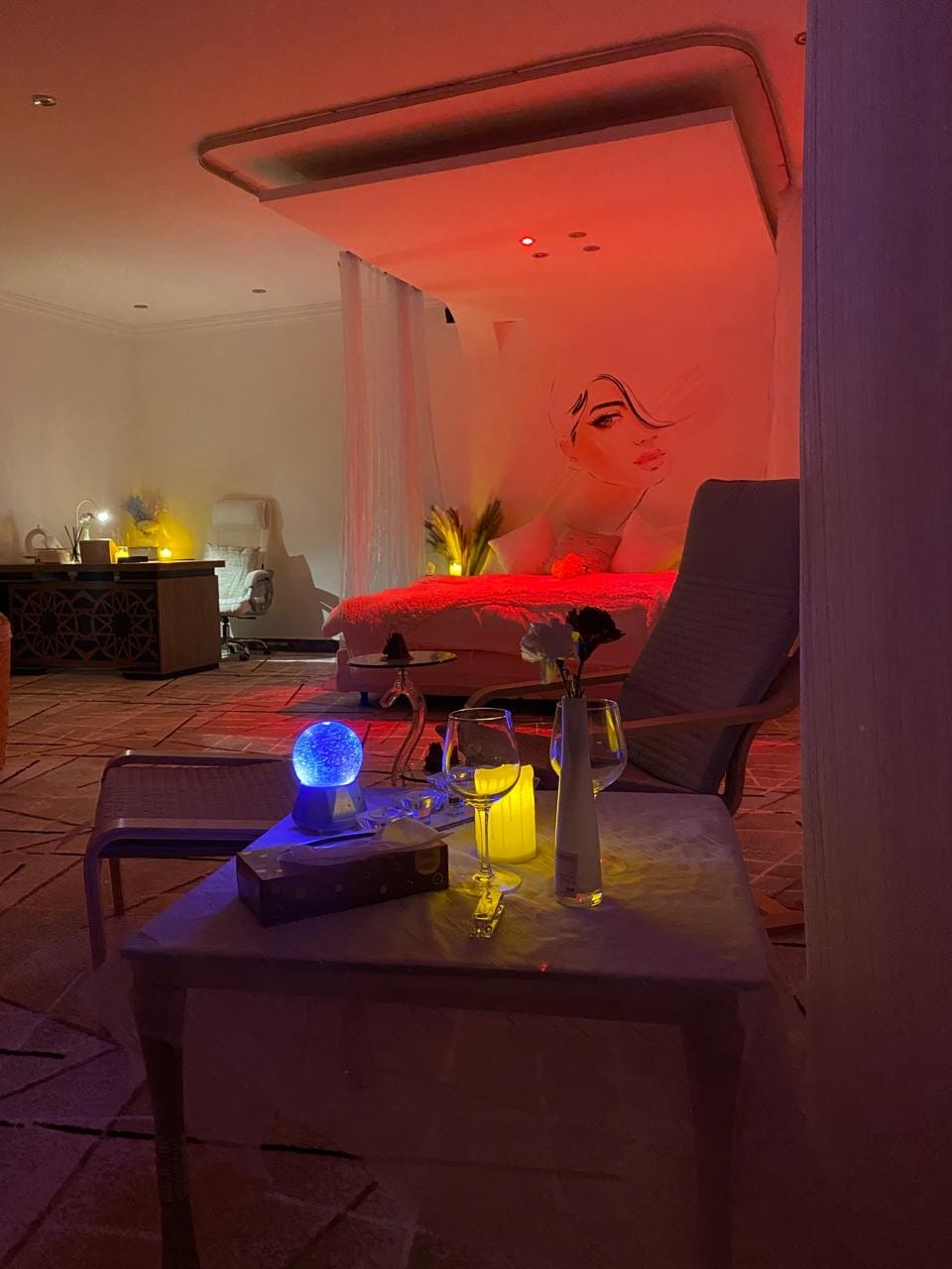 الغرفه غير مكرره من حيث كميه الهدوء والراحه النفسيه والاناقه والنعومه السرير محاط بستائر شفافه المفارش والارواب والمناشف باللون الابيض لمزيد من النظافه والراحه والاطمئنان وسناكات مميزه كميه راحه نفسيه ارضيه مفروشه بفرش ناعم وانيق اطلاله جميله بستائر كهربائيه على الفناء الخارجي المحاط بالأشجار الصغيره والورود المتنوعه الفناء مزود بالضباب الصناعي و أجهزة تكييف صحراوي تعمل بالماء جلسه حجازيه انيقه وناعمه
