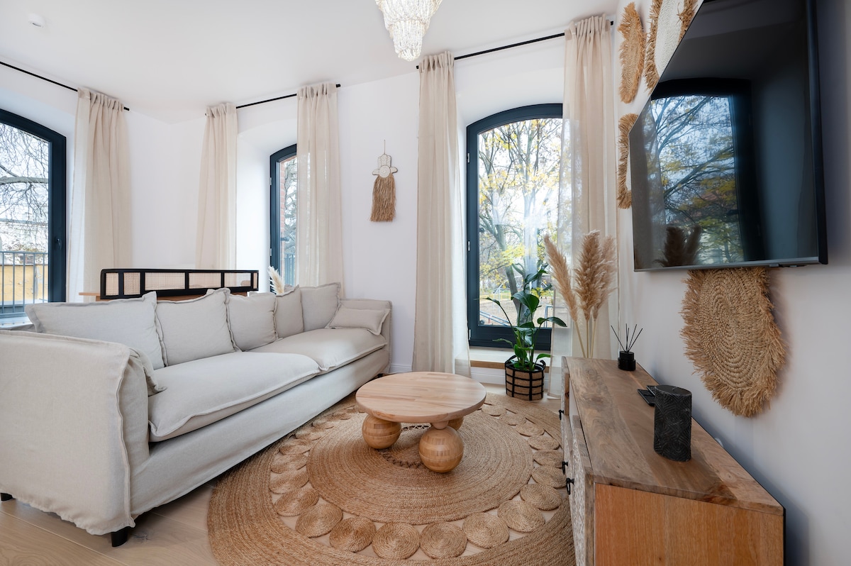 Iflethi entle kwindlu yosapho enomnyango owahlukileyo kunye nendawo yokuhlala. Indawo elungileyo kufutshane neTrasa Górna apho kulula ukufikelela kuzo zonke iindawo ezinomtsalane eŁódź nakwiidolophu ezikufutshane neŁódź. Le flethi ikwi-10 min ukusuka kwiAtlas Arena (ngemoto), i-15 min ukusuka ePiotrkowska kunye ne-20 min ukusuka eManufaktura. Isikhululo seenqwelomoya sikwi-10-15min kuphela ukusuka eflethini.