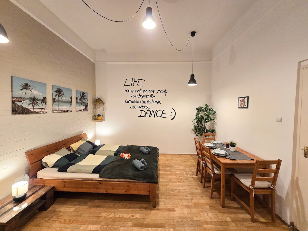 Ikhaya elihle nelikhethekileyo lilindele iindwendwe eBudapest, embindini wekota yangaphambili yamaYuda, ecaleni kweSinagoge enkulu eYurophu. Le flethi ifumaneka kwisakhiwo esitsha esinelifti. Iivenkile neevenkile zokutyela eziphambili zaseBudapest zinokufumaneka kule ndawo, nakwezona ndawo zidumileyo, izitrato zabantu abahamba ngeenyawo kwimizuzu embalwa uhamba ngeenyawo. Nangona isembindini wendawo ekuyo, le studio ithule kakhulu. Iifestile zeflethi zijonge igadi engaphakathi, eqinisekisa ukuphumla okuzolileyo.