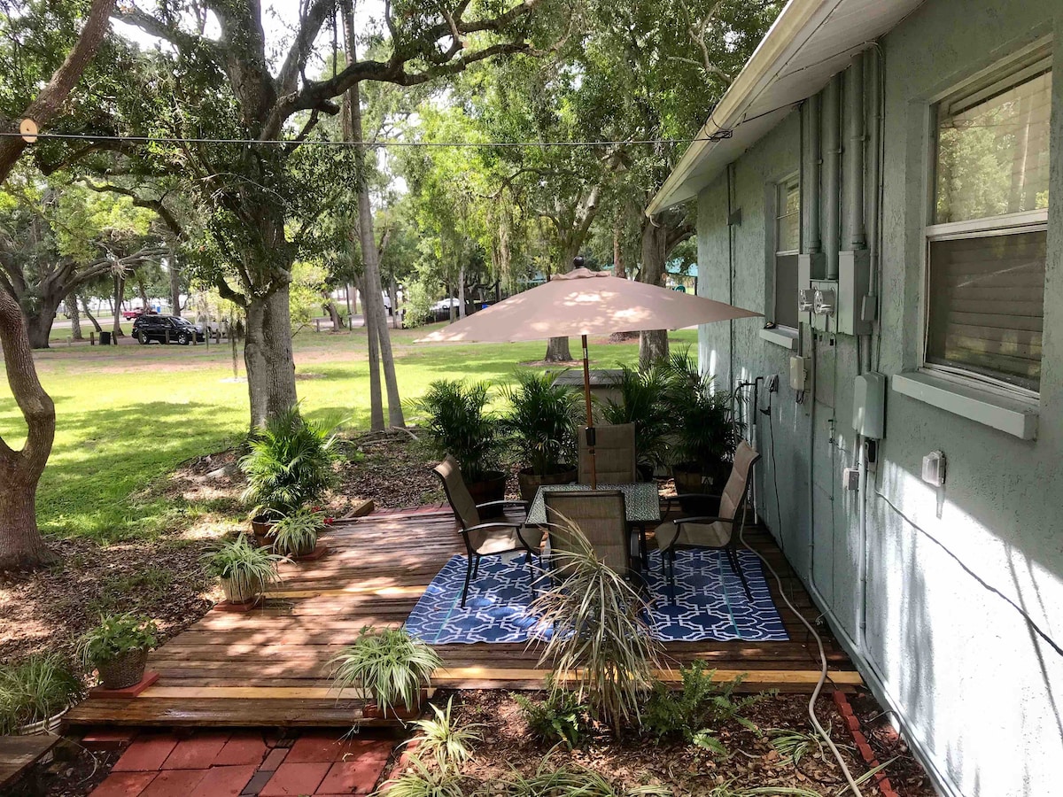 Ikhaya Lembali esembindini weDowntown Dunedin, elaziwa ngabantu basekuhlaleni njengeYellow House. Umgangatho wesibini 1 igumbi lokulala lilungiswe ngokupheleleyo. Hamba ngamanyathelo nje ambalwa ukuya kwiivenkile zokutyela, iibhari, iivenkile, kunye nePinellas Trail. Ikhaya lijonge iPioneer Park apho unokonwabela imarike yamafama asekuhlaleni ngeempelaveki, iikonsathi, iimuvi, imisitho yobugcisa kunye nokunye okuninzi. Hlala kwiveranda engaphambili uze ubone yonke into efumaneka eDunedin.