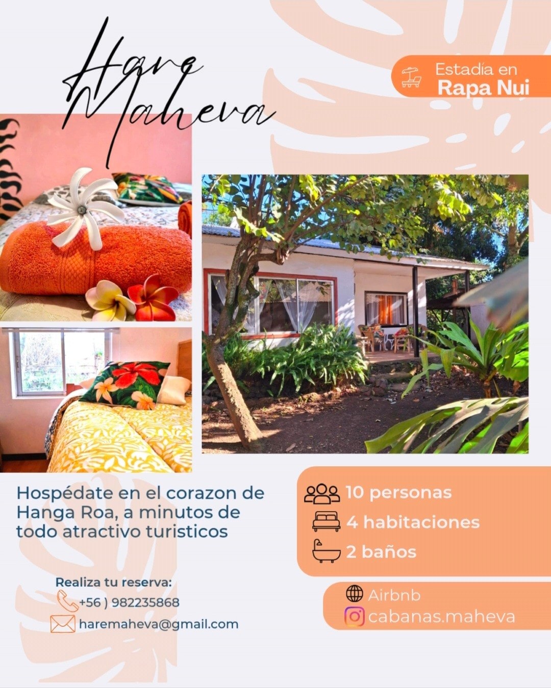 Indlu yamaplanga etofotofo enezinto ezinokusetyenziswa ezisisiseko ezifunekayo ukuze uhlale kuyo, kunye nokufikelela lula kwesinye sezona zitrato ziphambili kwilali iHaηa Roa, kwiCawa yamaKatolika kuphela, kwiivenkile ezinkulu ezahlukeneyo naselunxwemeni. Iquka iinkonzo zokuhamba ngesikhululo seenqwelo-moya. Sinezikhokelo eziqinisekisiweyo ezivela kwisizwe saseRapa Nui nohambo lwezikhephe oluya eMotu. Sikhangele phambili ekukuboneni, Iorana Maururu🗿