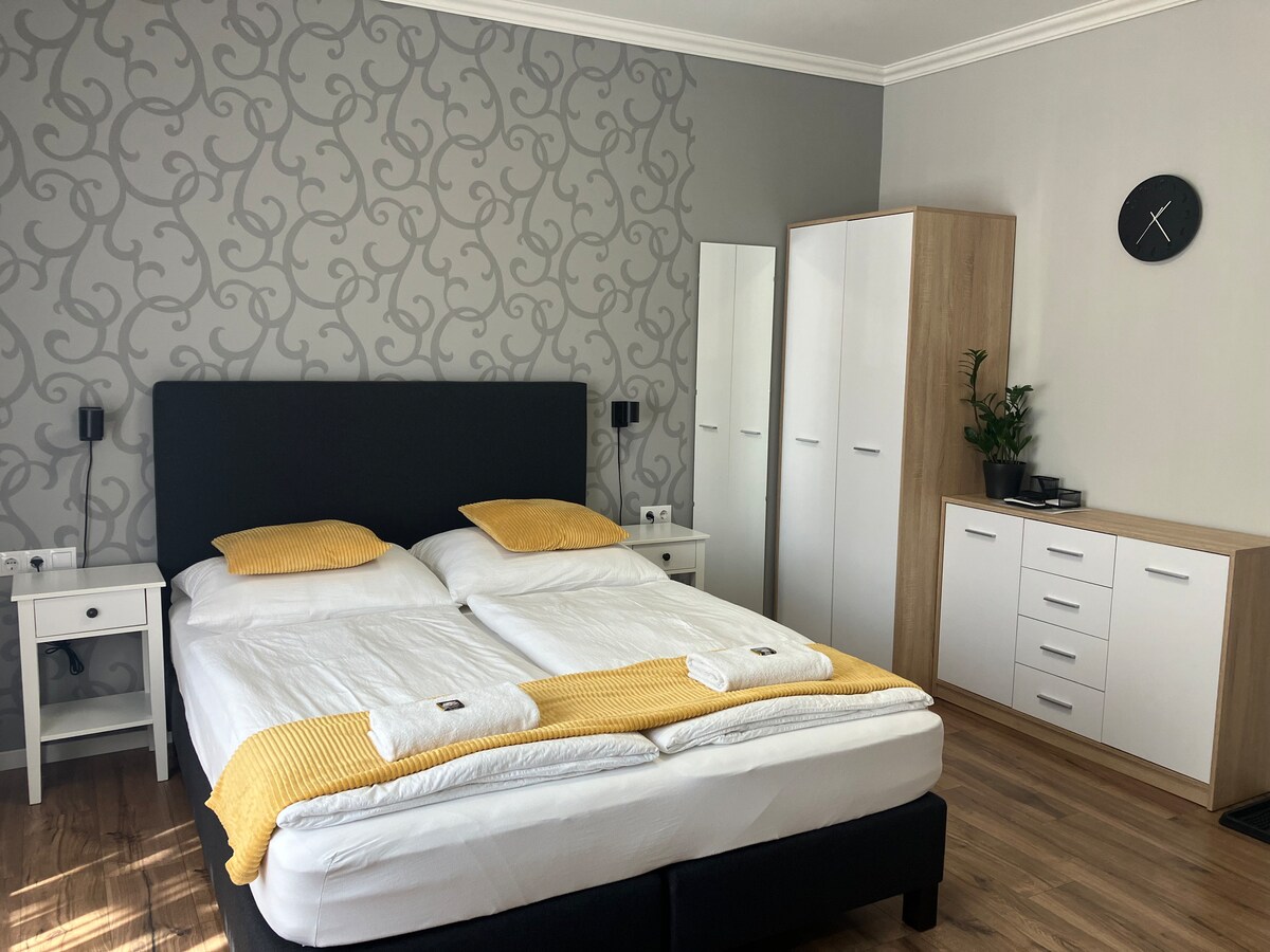 Ikwindawo ethe cwaka eluhlaza e-Eger, ndinegumbi lokuhlala elinegumbi lokulala elinye elikwicomplex eline-air conditioned kubakhenkethi ababuka isixeko, ecaleni kwebhafu enobushushu. Ibhalkhoni inendawo entle yesixeko neenduli ezijikelezileyo. Le ndlu inelifti eqoqoshiweyo nelungisiweyo. Indawo yokupaka engabhatalelwayo kule ndlu. Idolophu enembali inokufikelelwa uhamba ngeenyawo kwimizuzu eyi-5 ukuya kweyi-5 kwipaki yesixeko, iGadi yezombuluko, kunye neyona ndawo iphambili kwi-Eger Creek.