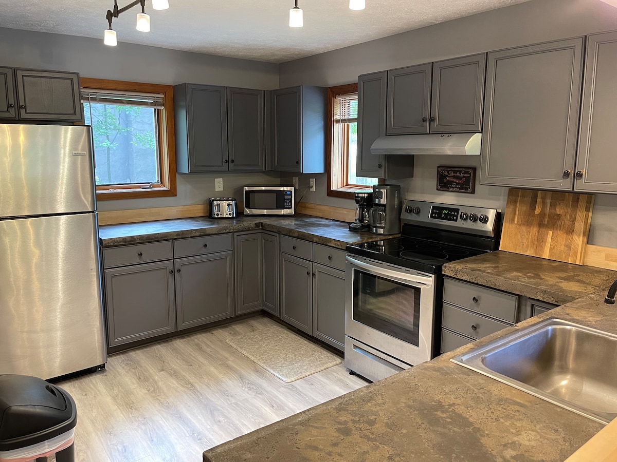 Yonke iTafile yokutyela neZitulo ezintsha, Ifenitshala yeGumbi lokuhlala, Ifenitshala yegumbi elingaphantsi, kunye noomatrasi beTuft & Needle kuzo zonke iibhedi ezinkulu. Izinto ezinokusetyenziswa zale mihla nomoya wecottage yasezilalini yendalo. I-Hemlock Hideaway e-Harbor Springs ikwindawo entle kakhulu yazo zonke izinto zokuzonwabisa zase-Northern Michigan! Igumbi elingaphantsi linetafile yepuli, iTV enesixhobo sokustrima iRoku, i-soundbar eneBluetooth, ne-sauna yangaphakathi. Phezulu kwindawo yokubasa igesi nemidlalo yendlu. Ngaphandle kukho iveranda epheleleyo ejikelezileyo enendawo yokubasa umlilo enesinyithi esineentunja esinokusetyenziswa ehlotyeni.