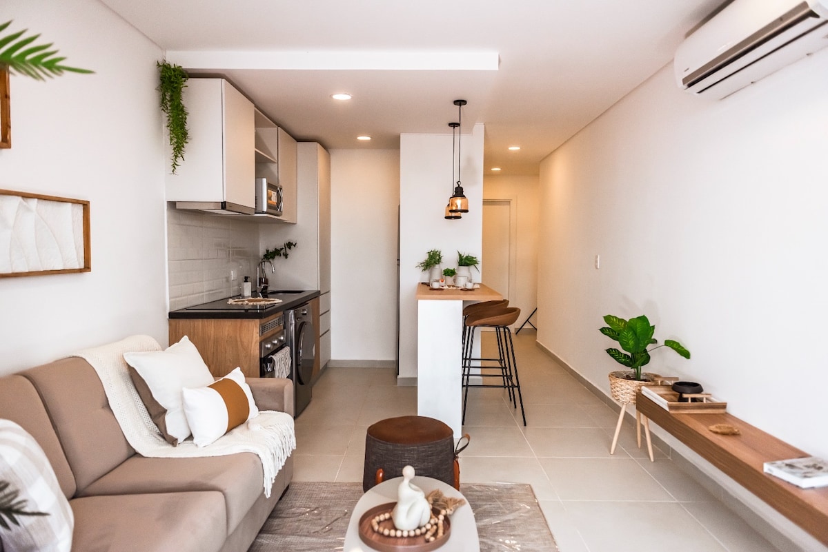 Yonwabela izinto ezihonjiswe kakuhle kweli khaya ngeyona ndawo intle esixekweni! Iflethi ekumgangatho ophezulu enazo zonke izinto ezikwenza uzive uthe zava ukuze ube nexesha elimnandi! Iindawo ezivulekileyo, iindawo ezintle, nezona ndawo zintle zokutshona kwelanga! Yonke into ikumgama onokuya ngawo ngeenyawo, iimitha eziyi-100 ukusuka kwisixeko, iimitha eziyi-100 ukusuka kulwandle lwaseSan José.