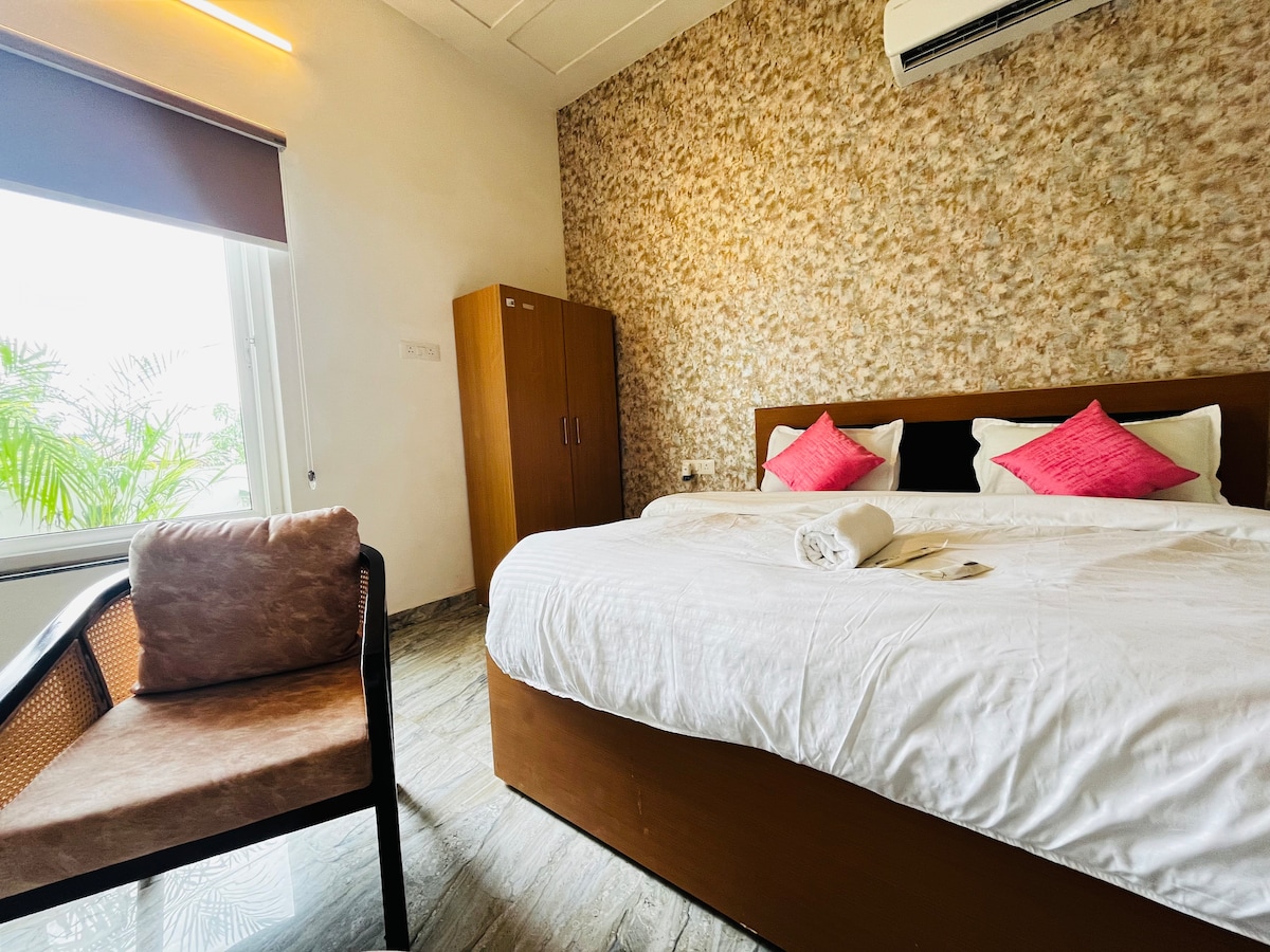 Fumana ubunewunewu obucocekileyo eDev Homestay, apho ukuhlala kamnandi kudibana khona nokomoya kwindlu yethu kunye ne-2 Deluxe Supenior Double Bedrooms. Le ndawo ingcwele eyi-340 sq.ft ibonisa ubuhle kunye nomphakathi wayo omhle kakhulu. Yonwabela ukwamkelwa kwebhedi enkulu, ehamba nesofa etofotofo nokuzonwabisa kwiTV. Zonwabise ngezinto ezinokusetyenziswa ezininzi ezikumgangatho ophezulu ngoxa wonwabela indawo yethu ephambili eAyodhya, kufutshane neRam Janmabhoomi, kwenye yezona ndawo zintle zaseAyodhya ezinegadi.