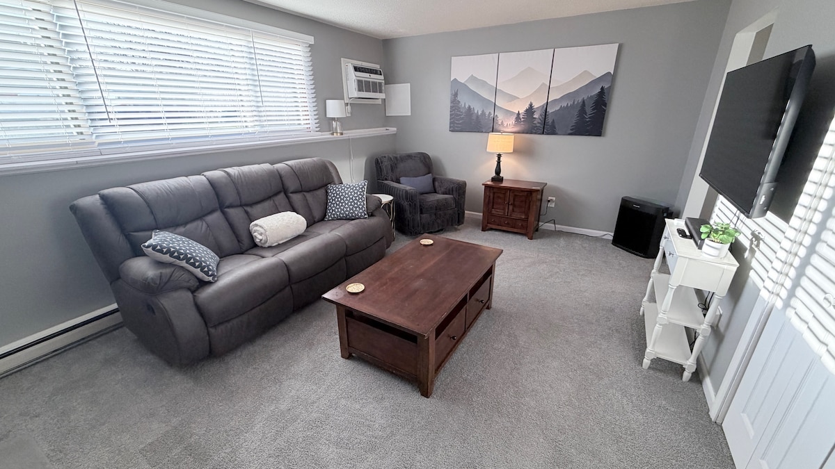 Indawo yokuphumla yabucala enee-bhedi eziyi-3 kumgangatho ophezulu elala abantu abayi-8 kwindawo entle: ibhedi enkulu enebhafu yamanzi ashushu yabucala + indawo yokuhlambela, igumbi lokulala elineveranda yabucala, iibhedi ezinkulu eziyi-2, isofa ekwayibhedi + enye—zonke zine-matrasi ye-memory foam enombala omnyama nezinto zebhedi ezikumgangatho ophezulu. Izitulo zesikhumba ezinokulaliswa (8+), i-TV eyi-70" eneNetflix, iYouTube TV, iPeacock. Ikhitshi elipheleleyo nedekhi enegrisi yegesi + indawo yokutyela. I-AC esembindini + i-mini-split, i-Wi-Fi eyi-500 Mbps, ukungena nge-PIN ngaphandle kokubamba. Hamba uye kwikhampasi ye-MSUM, kwi-Vic's Bar (iibhloko eziyi-2); ½ mi ukuya kwivenkile yokutya/i-DQ; imizuzu eyi-4 nge-Uber ukuya kwiziko ledolophu i-Fargo. Ilungele amaqela! Bhukisha ngoku!