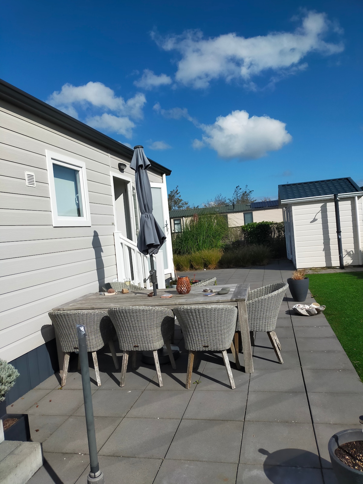 Indlu yeholide eyakhiwe ngamaplanga yabantu abayi-4. Ekunene ngaselunxwemeni 🏖 Sun canopy, , lounge set with pillow box, picnic table, round table with 4 rattan chair. I-canopy enomnyango otyibilikayo Ibhedi elala abantu ababini eyi-1 neebhedi ezimbini ezilala abantu ababini. Ibhedi enkulu inomatrasi ophindwe kabini oneeduveyi enye. Kukho umkhombe wosana okhoyo. Akukho bantu batshayayo. Ziphathele amashiti neetawuli. Unokubonelelwa nathi ngemali ye- € 15 umntu ngamnye. -> cela xa ubhukisha. Ubuncinane iintsuku eziyi-2. Ufika ukususela ngo-1 emva kwemini,uhamba ngaphambi ko-12 emini