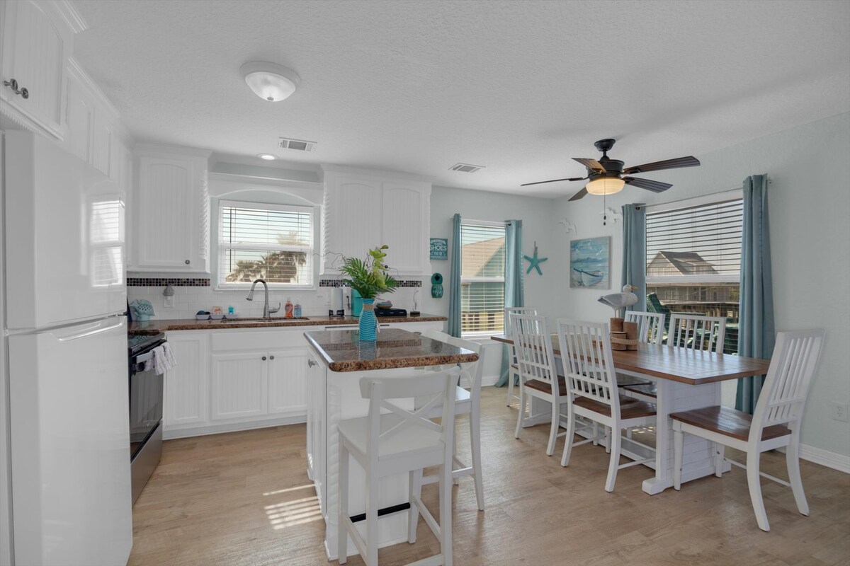 Wamkelekile eCasa Luz Del Sol . Ezisandul 'ukuhonjiswa & ezidwelisiweyo. 1,232sqft Igumbi lokulala eliyi-3, igumbi lokuhlambela elihle eliyi-2, ikhaya elitofotofo nelipholileyo kunye neveranda engasemva evumela ukubuka ukuphuma kwelanga kwakusasa nokutshona kwelanga okuhle. Ilungele iindwendwe eziyi-6 ukuya kweziyi-8. Ilungele iintsapho kunye nabahlobo abakhangela iholide elunxwemeni eyonwabisayo kunye neekhilomitha eziyi-17 zokungena elwandle kude nobomi obuxakekileyo/ ingxolo yaseGalveston. Unxweme lwethu lukumgama wokuhamba ngeenyawo lokuloba, ukuqubha, ukuqokelela iqokobhe okanye ukutshona kwelanga.