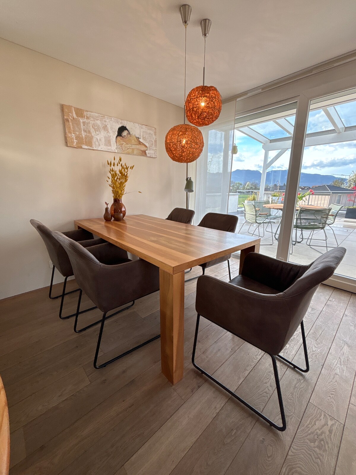 Unsere gemütliche Penthousewohnung mit 100m Wohnfläche & 140m Dachterrasse im Grünen begeistert! - 1 masterbedroom mit Doppelbett - 1 riesengrosse moderne Wohnküche… Esstisch, Couch und Waschmaschine & Trockner - 1 gratis Parkplatz - 10 Minuten nach Dornbirn (Messe), Bregenz und in die Schweiz Die Aussicht auf die österreichischen und schweizerischen Berge genießt man auf der neu sanierten dachterrasse