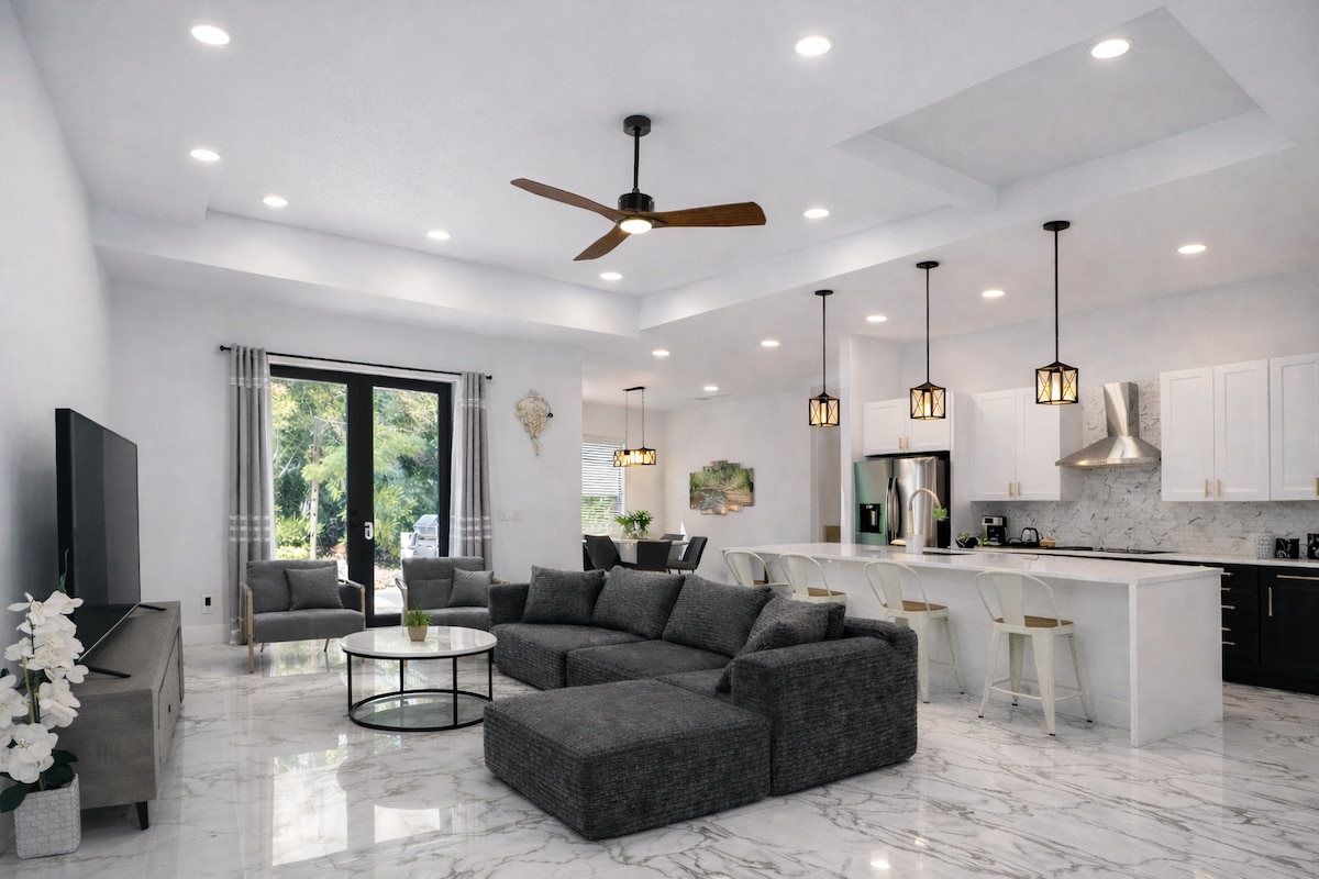 Yonwabela ukuhamba kule ndawo yokuhlala isandul 'ukwakhiwa eneefestile neengcango ezichaphazelekayo. Le ndlu iseLehigh Acres ekumgama wemizuzu nje embalwa ukusuka elunxwemeni lwaseFort Myers nakwisikhululo seenqwelo-moya iRSW. Eli gumbi lokulala liyi-3, igumbi lokuhlambela eliyi-2 eliqeshisayo leholide lilala abantu abayi-6 ibe lineJetted Tub, i-wifi, i-smart tv kwigumbi ngalinye, ibhari yesandi, indawo yekofu/ibhari, Inkqubo Yokhuseleko Lwekhaya, umatshini wokuhlamba nowokomisa impahla, iyadi engasemva entle evulekileyo ibe ilungele izilwanyana zasekhaya. Bhalisa xa ufika uze uzibhalisele ukufika.