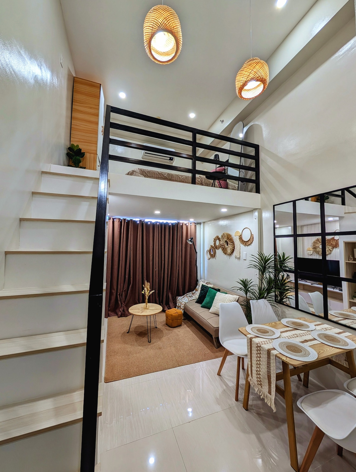 I-HappyStays#3 ngumgangatho ophantsi ohonjiswe kakuhle, iflethi enophahla oluphezulu. Ine-loft enkulu eyandisa indawo esebenzayo ukuya kwi-33sqm (xa kuthelekiswa ne-28.5sqm eqhelekileyo). Kumgangatho osezantsi we-loft kukho ibhedi enkulu kwaye i-loft ephezulu inokuhlala abantu abayi-3. Yonwabela i-TV yethu yee-intshi eziyi-65 kwi-wifi ekhawuleza kakhulu eyi-300mbps w/ NTFLX, iHBO, iPrime neDisney. Inekhitshi elipheleleyo kunye nezixhobo zasekhaya, kuquka umatshini wokuhlamba kunye nento yokuhambisa amanzi yombane (w/ 3 iigaloni zamanzi ezijikelezileyo) ukuze kube lula ukuhlala kuyo. Ifumaneka ecaleni kwe-SM Mall.