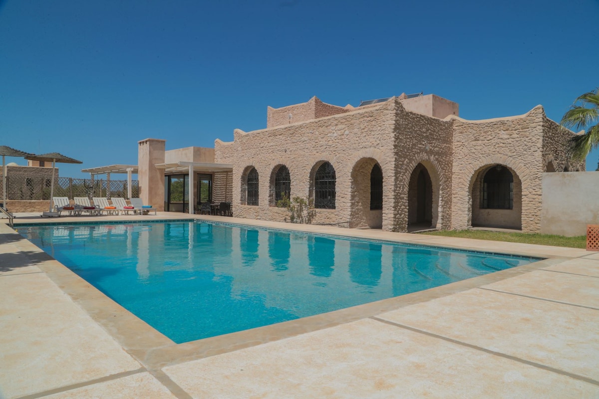 Villa berbère de charme 300 m2 pour un moment unique à 10mn d'Essaouira . Profitez de la piscine chauffée , du jardin luxuriant , des espaces détente , de l'aménagement raffiné, de cette très belle villa en pierres locales typique au charme élégant et reposant. 4 chambres avec SDB, larges espaces de vie, salons, terrasses, solarium, terrain de pétanque, cheminées, très fleuri et au calme . Possibilité de repas / petits déjeuners traditionnels. Possibilité de location de voiture