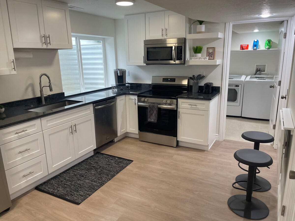 Igumbi elinomnyango ophumela ngaphandle eliyi-1600 + sq ft (igumbi elingaphantsi kwelanga), indawo yokungena yabucala, kwindawo entsha nengingqi ezolileyo. Zonke izinto eziluncedo ngoxa uziva ngathi uselizweni. Ivuleke kakhulu ibe inento yonke oza kuyidinga. Ikofu yasimahla, i-cocoa eshushu nokungakumbi. Kufuphi nendawo yokuhamba (I-15), iindlela, iivenkile zokuthenga neevenkile zokutyela, iBYU, iUVU, iNebo Scenic Loop, iUtah Lake, iitempile zeLDS nokunye okuninzi. Akuvumelekanga ukutshaya, utywala okanye iziyobisi eziseyadini. Qaphela: ukususela nge-1 kaNovemba ukuya nge-31 kaMatshi akukho ndawo yokupaka esitratweni ubusuku bonke.