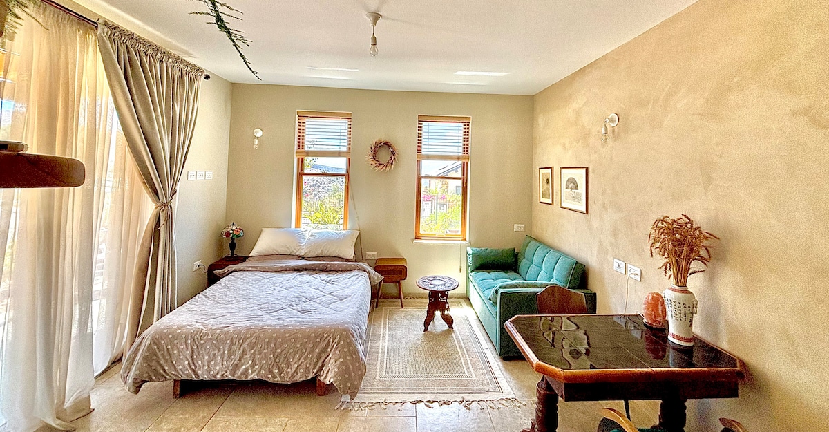 Cabin 1 named Beit Abir w Lama is a cozy wooden retreat, part of a set of two cabins that share a common outdoor space and a well-equipped kitchen. The cabin itself offers a private toilet and shower, 1 single bed with wooden pallet bases, and 1 sofa bed for an additional guest. 🍳 A Village Breakfast is served: Mon–Sat: 8:30–11:30 (seated) Sun: 9:30–12:30 (open buffet) Served outdoors on sunny days or in the cozy art studio during winter.