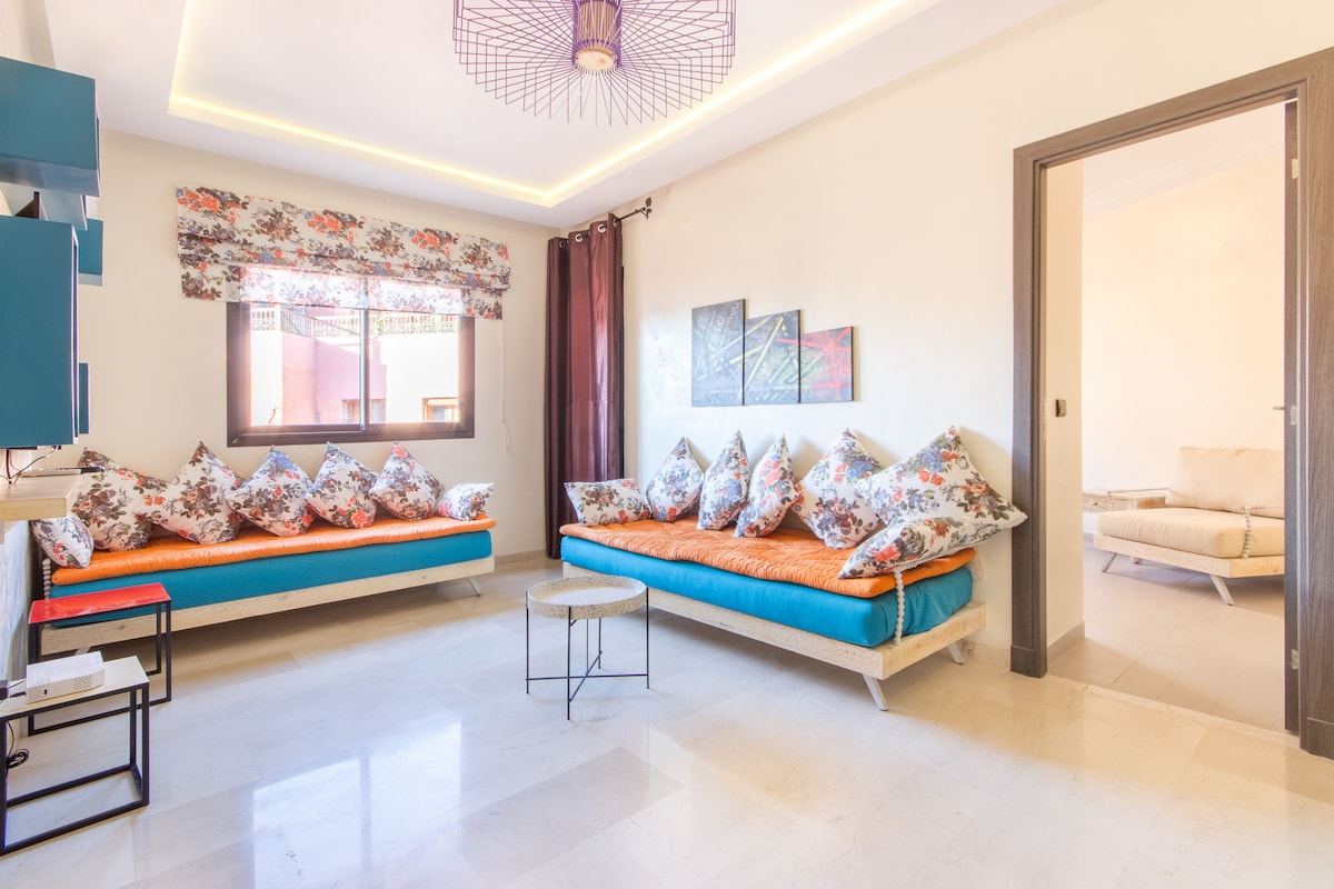 Fumana iflethi ekhethekileyo apho umtsalane waseBali udibana nomtsalane waseMarrakech. Iflethi yethu ekulungeleyo ukukunika indawo yokuhlala engalibalekiyo, inokuhlala abantu abayi-4 kwindawo etofotofo. Uhambo lwakho luqala kwi-terrace enkulu enelanga, into enqabileyo embindini wesixeko. Apha, iibhedi zelanga zikulindile, zikulungele ukwamkela amaxesha akho okuphumla nezihlandlo zokuhlamba ilanga phantsi kwelanga laseMorocco.